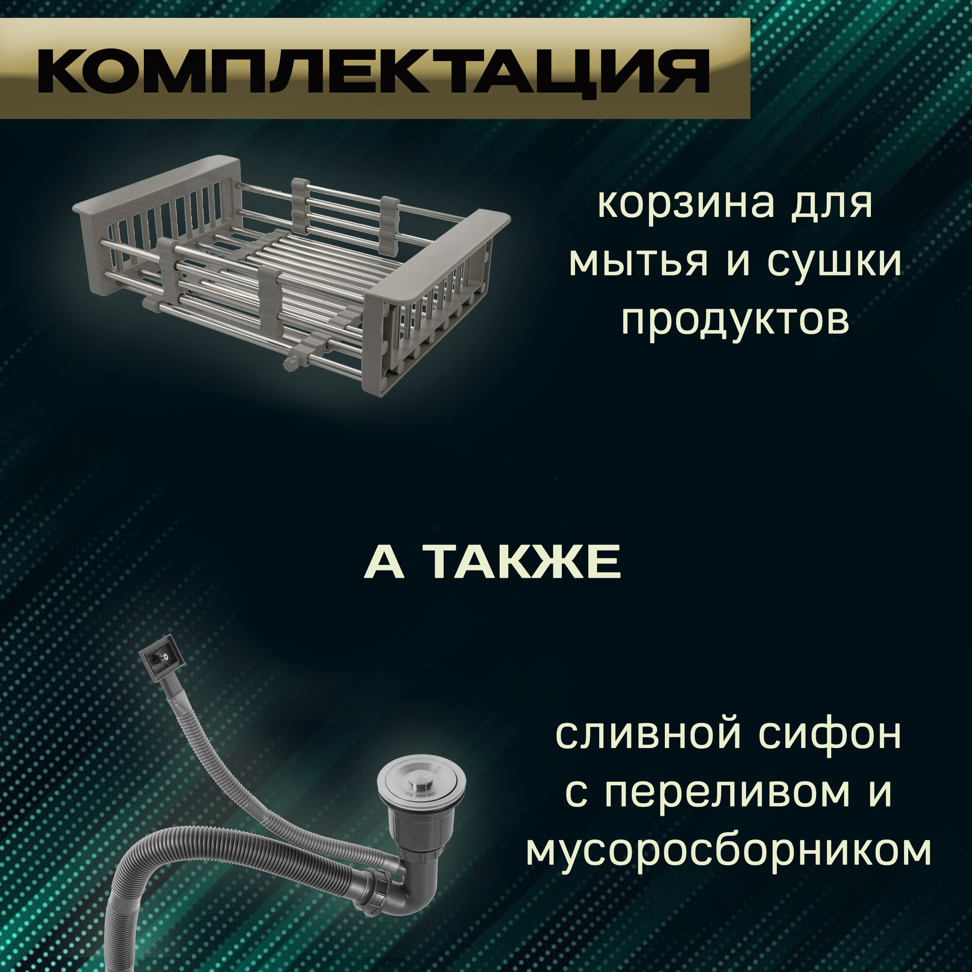 Мойка SIRIUSLINE Premium 60х45 из нержавеющей стали Графит SL6045G (в комплекте с коландером, врезным дозатором, и сифоном) толщина стали 3 мм