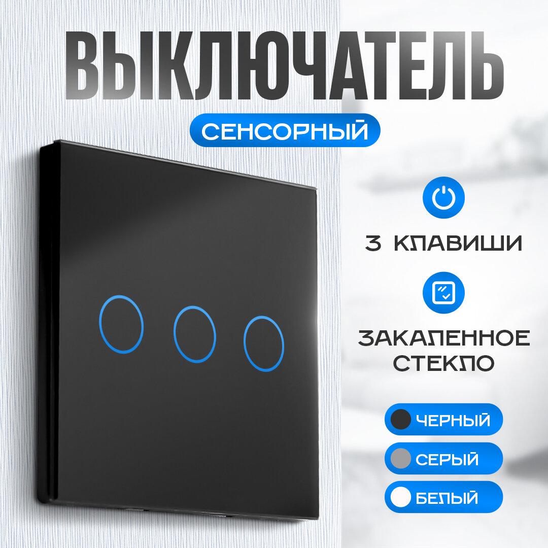Сенсорный выключатель стеклянный Easy Tech/ выключатель трехклавишный черный, 300W/ переключатель света