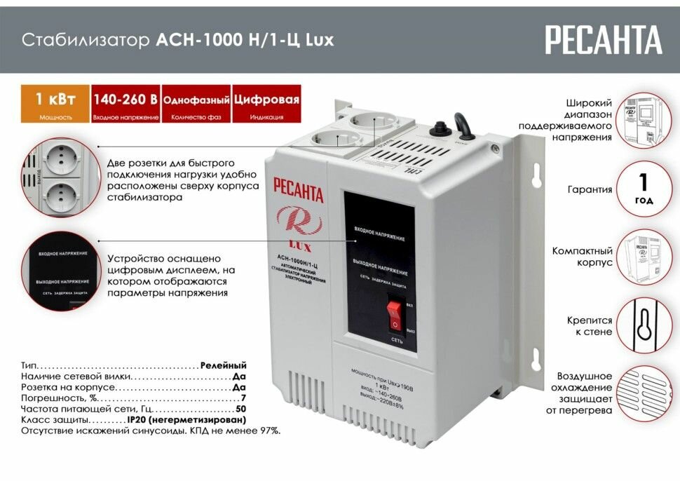 Стабилизатор напряжения АСН-1000 Н/1-Ц Lux 220В, 1000 Вт, релейный с цифр. диспл., Ресанта электротовар