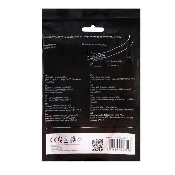 Купить Кабель SATAIII - 30см Кабель данных Cablexpert CC-SATAM-DATA90-0.3M с защелкой, угловой разъем,