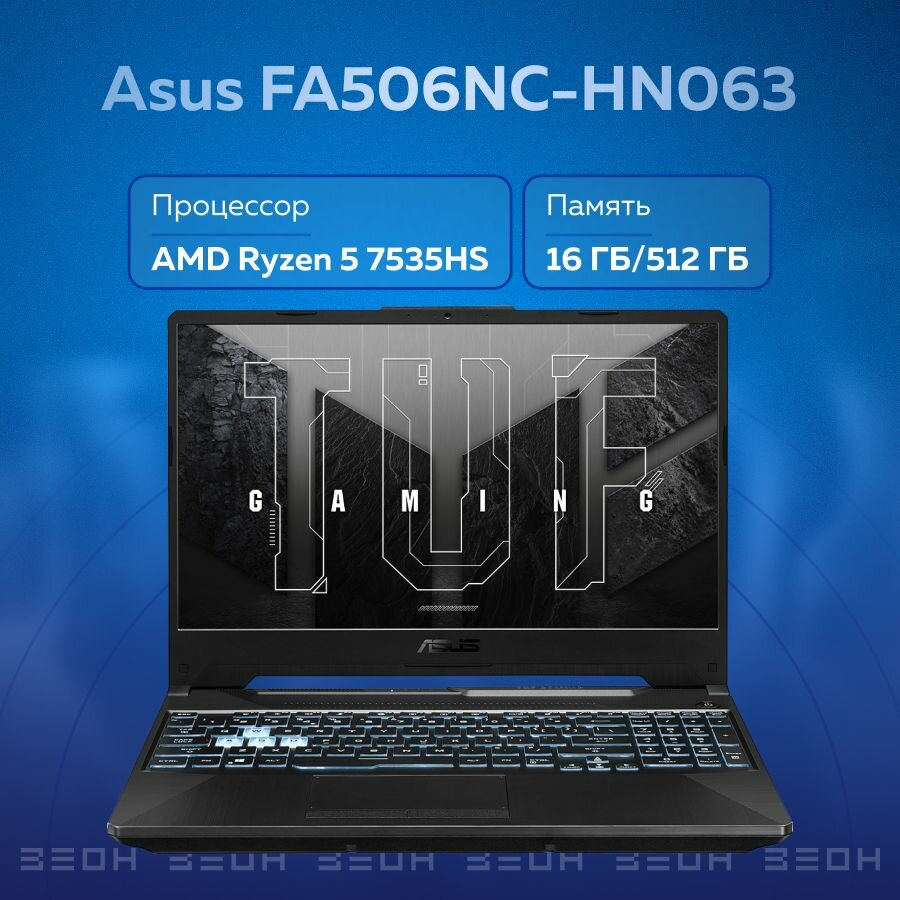 Ноутбук Asus TUF Gaming FA506NC-HN063, 15.6", IPS, AMD Ryzen 5 7535HS, DDR5 16ГБ, SSD 512ГБ, NVIDIA GeForce RTX 3050 для ноутбуков 4ГБ, черный (90nr0jf7-m005d0)