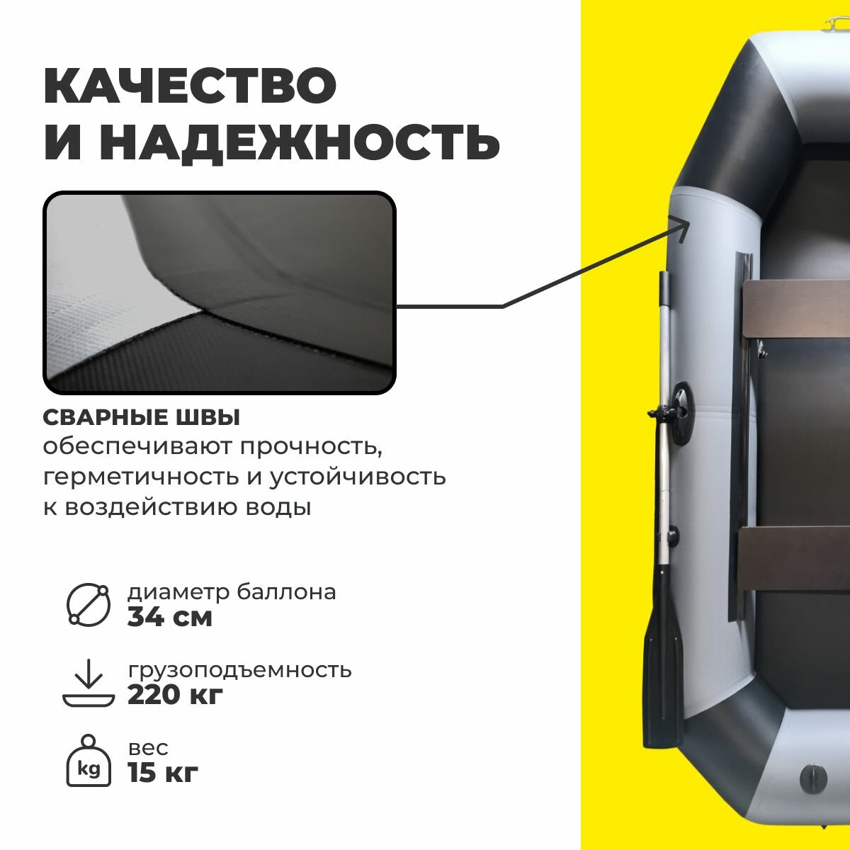 Лодка надувная ПВХ Лодки Поволжья S-265 для рыбалки гребная двухместная, крепления для транца под мотор, серо-черная