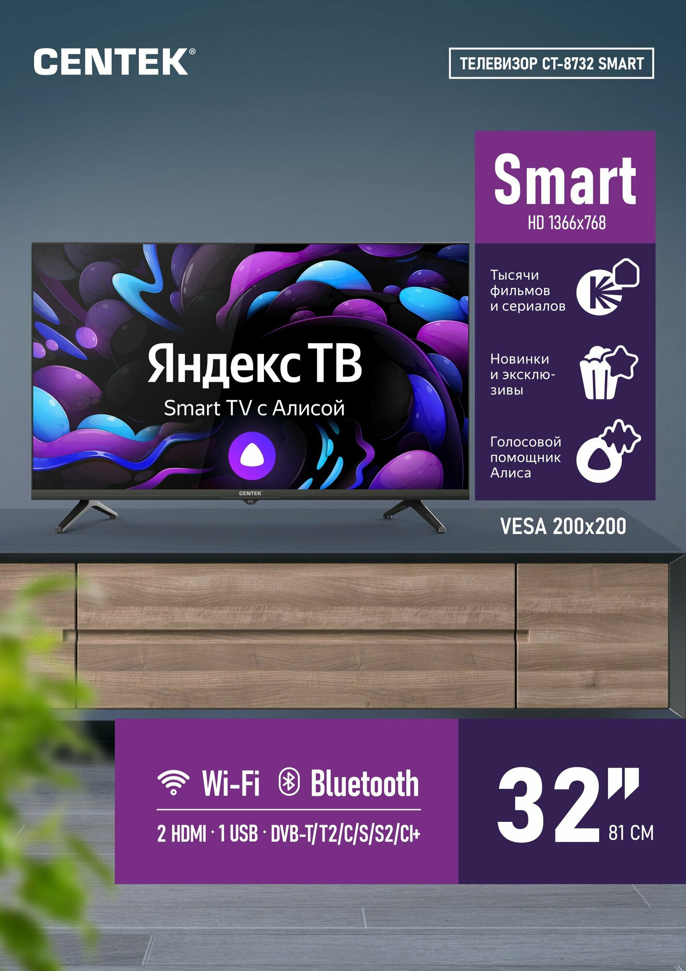 Телевизор CENTEK CT-8732: SMART, 32 дюйма HD, Wi-Fi, Bluetooth, HDMIx2, USBx1, DVB-T/T2, Яндекс YaOS, Алиса
