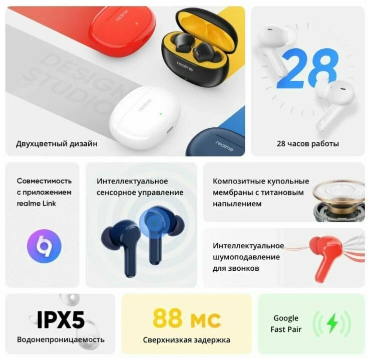 Bluetooth-гарнитура Realme Buds T310, длительное время автономной работы, 50 мс, низкая задержка