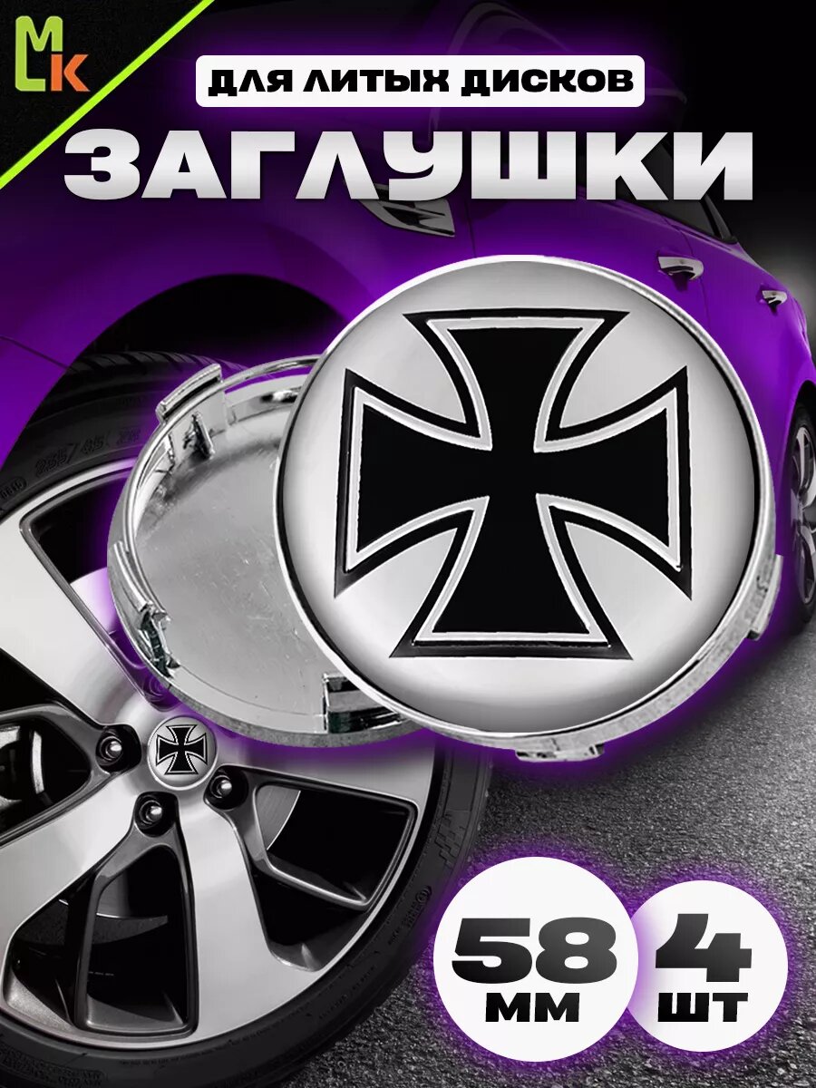 Колпачки на ступицу колеса 4 шт, автоколпак, заглушка диска, колпачки в автомобильные диски, с эмблемой Крест хром посадочный диаметр 58 мм
