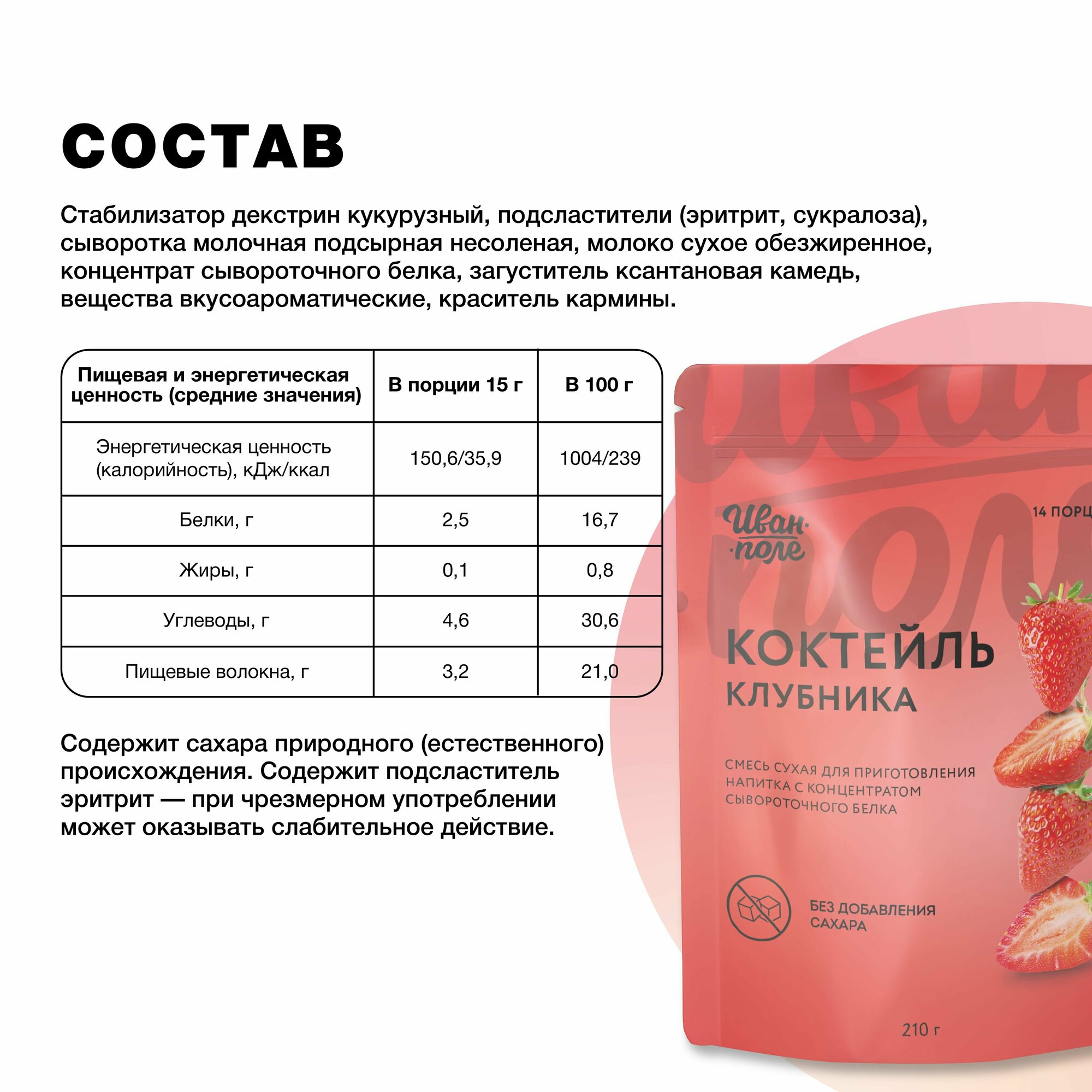 Молочный коктейль Иван-поле Клубника, протеиновый для снижения веса, 210 г/14 порций