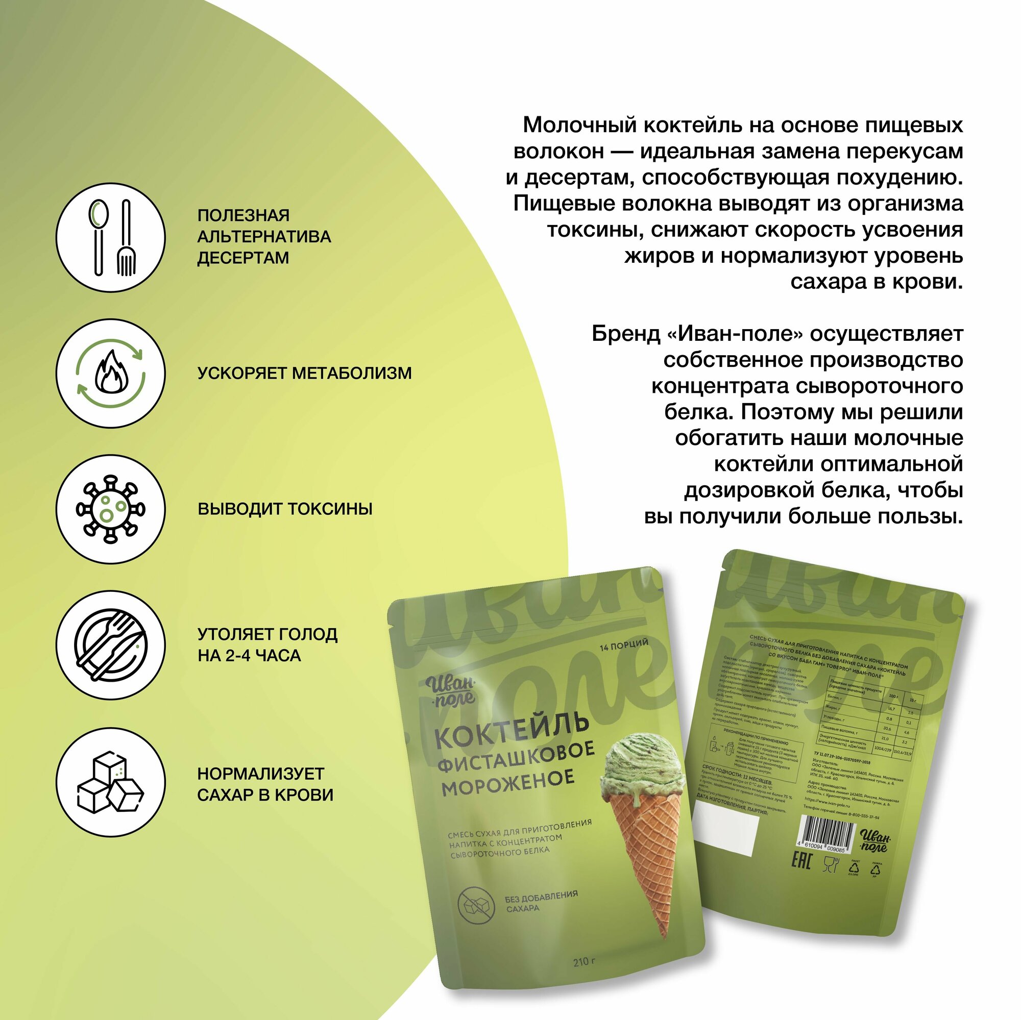 Молочный коктейль Иван-поле Фисташковое мороженое, протеиновый для снижения веса, 210 г/14 порций