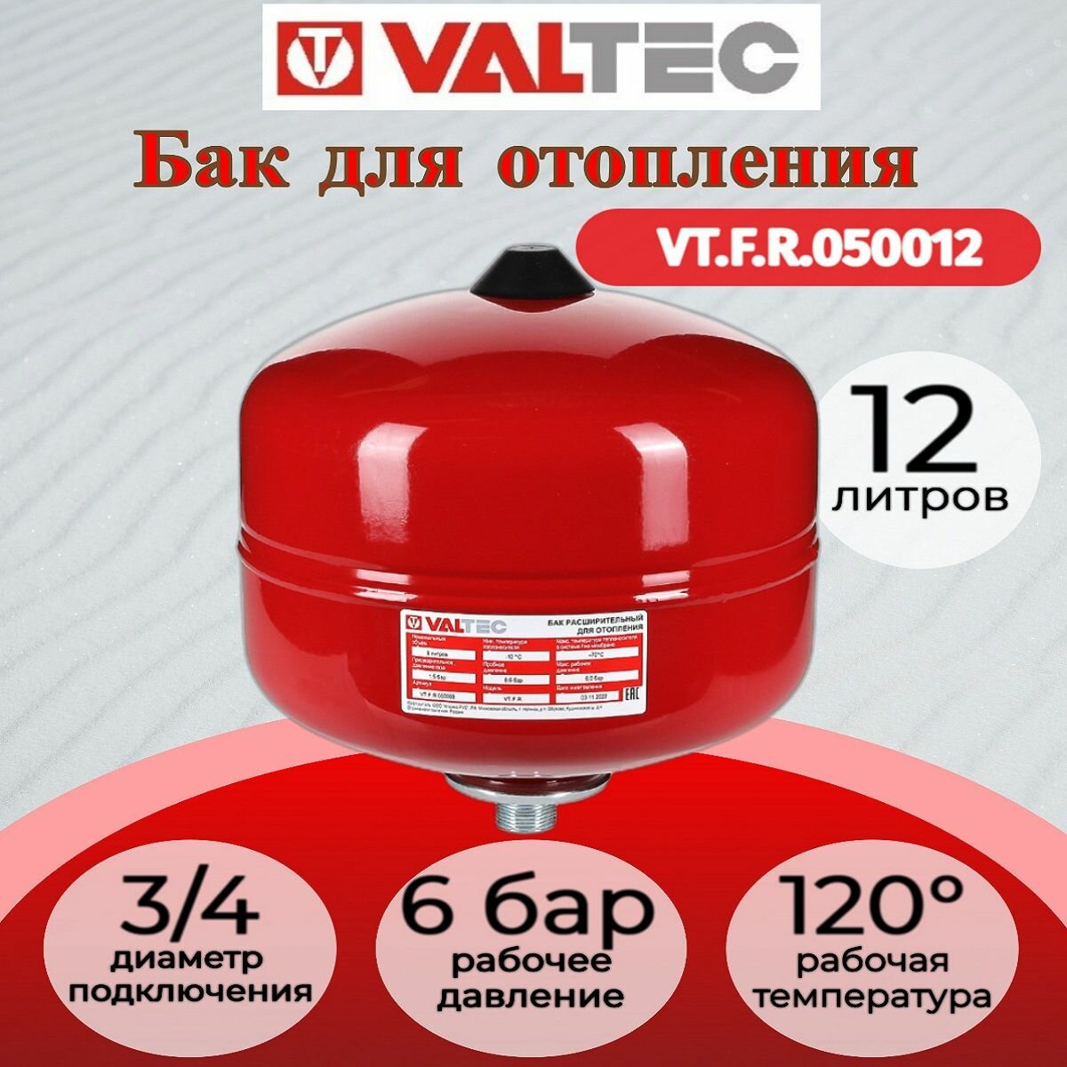 Бак мембранный для систем отопления VALTEC 12л./1,5 - 6bar (3/4") VT. F. R.050012