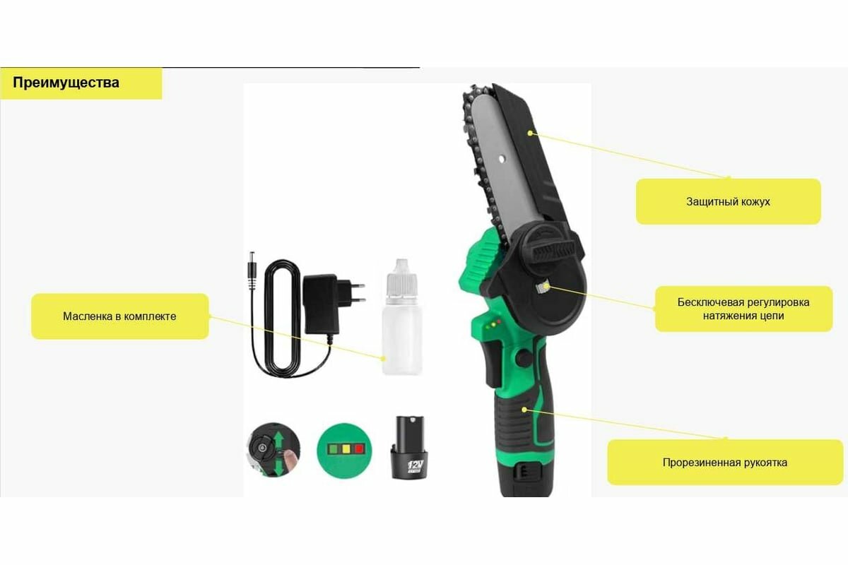 Пила цепная аккумуляторная Zitrek GreenSaw 12 (12В, 1.5Ач Li-ion аккум. 2шт, ЗУ) 082-1859 интересное: