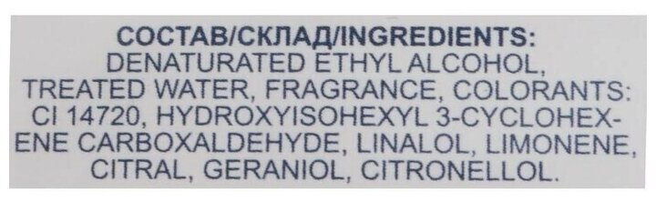| Состав | Этиловый денатурированный спирт, парфюмерная композиция, бензилбензоат, бензиловый спирт, кумарин, бензилсалицилат, цитронеллол, линалоол, вода |