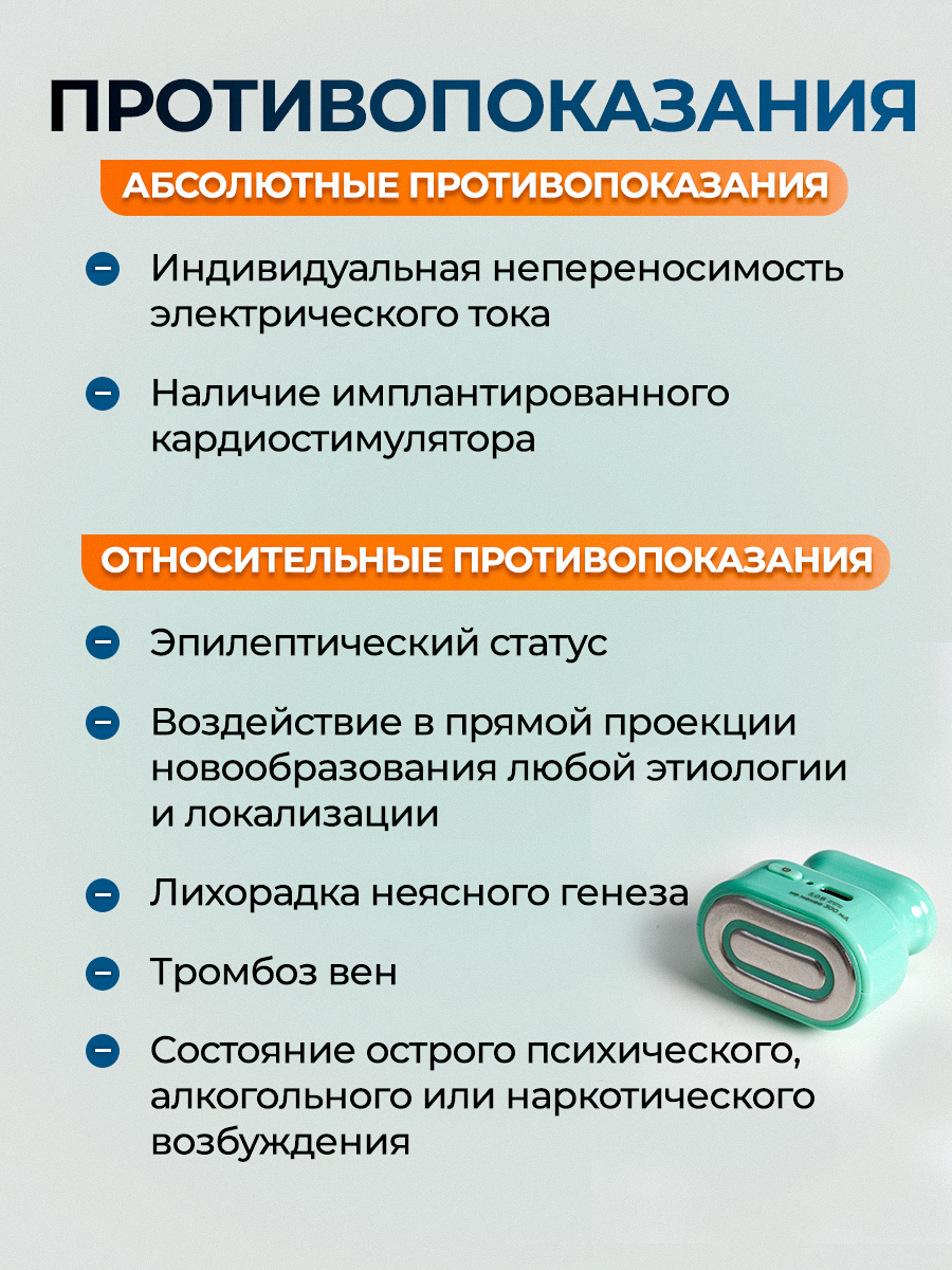 | Противопоказания | индивидуальная непереносимость; наличие имплантированного кардиостимулятора; эпилептический статус; новообразования любой этиологии и локализации; острые лихорадочные состояния невыясненной этиологии; тромбозы вен; состояние острого психического, алкогольного или наркотического возбуждения |