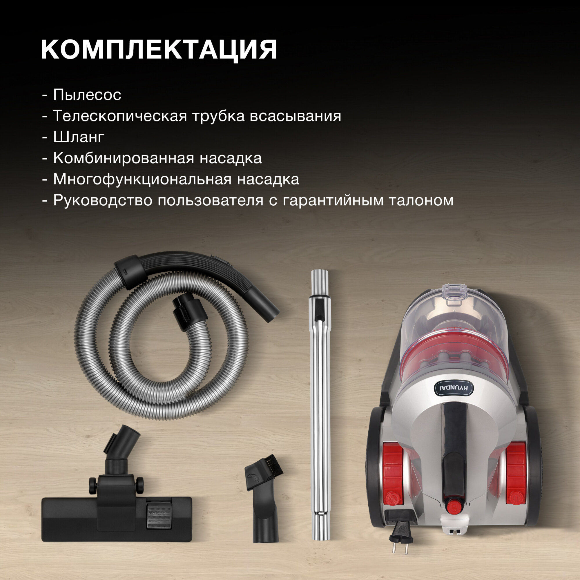 Пылесос Hyundai HYV-C2645 2200Вт красный/черный, Работа с контейнером для пыли, Место для хранения насадок