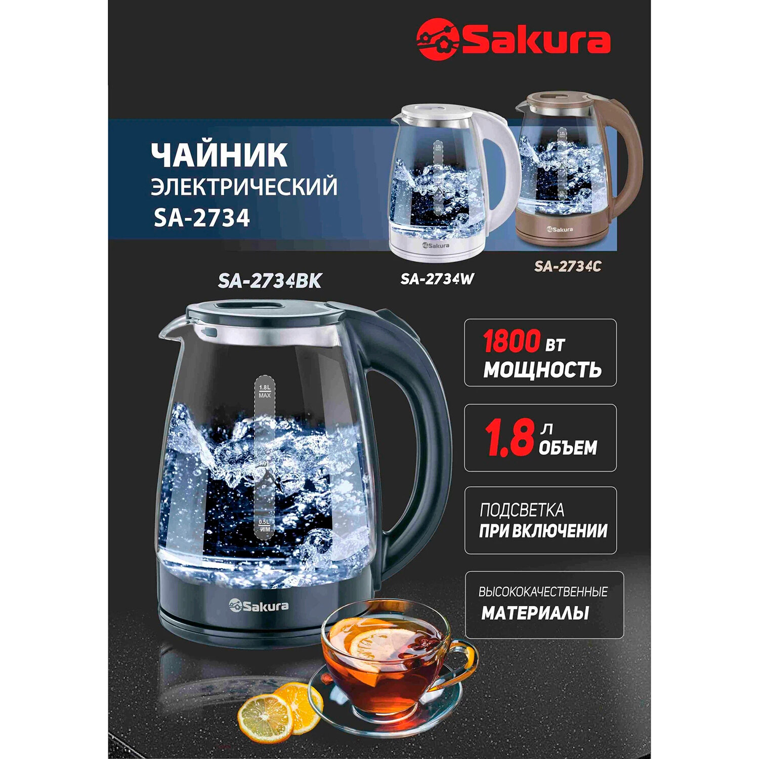 Чайник электрический SAKURA SA-2734BK 1.8л, 1500-1800Вт, подсветка, стекло, пластик