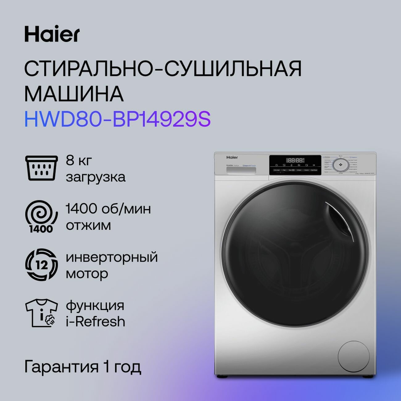 Стиральная машина с сушкой Haier HWD80-BP14929A белая на 8 кг и 5 кг сушки, отжим 1400 об/мин