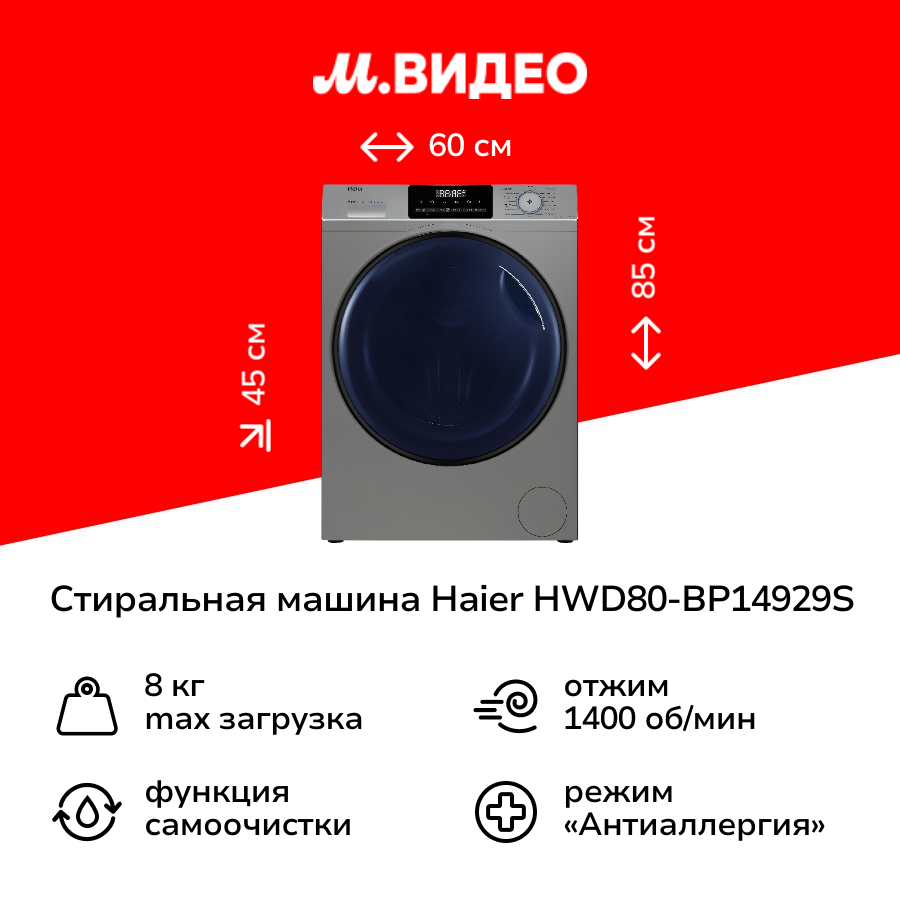 Стирально-сушильная машина Haier HWD80-BP14929S серая , максимальная загрузка 8 кг, максимальный отжим 1400 об/мин, 15 программ, функция сушки, Инверторный мотор интересное: