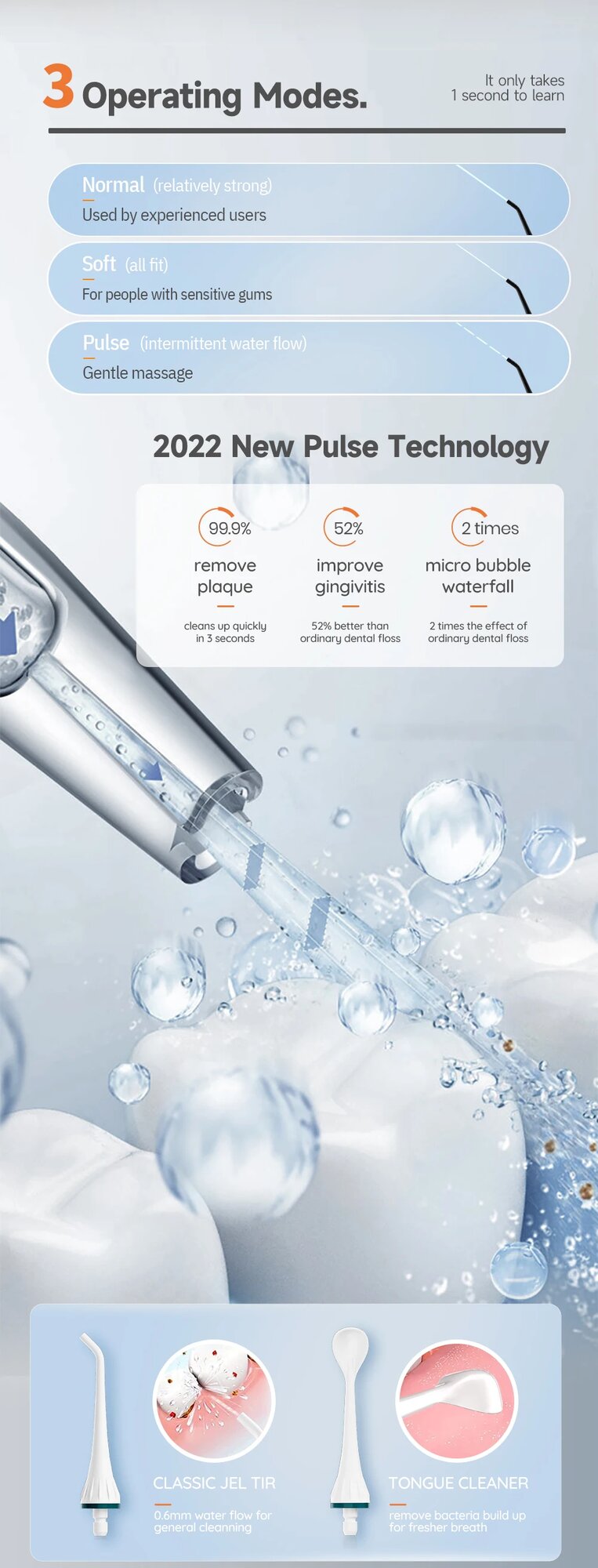 | Насадки | для струйной чистки / для чистки имплантов и коронок / для чистки языка / ортодонтическая (для брекетов) / пародонтологическая (для десен) |