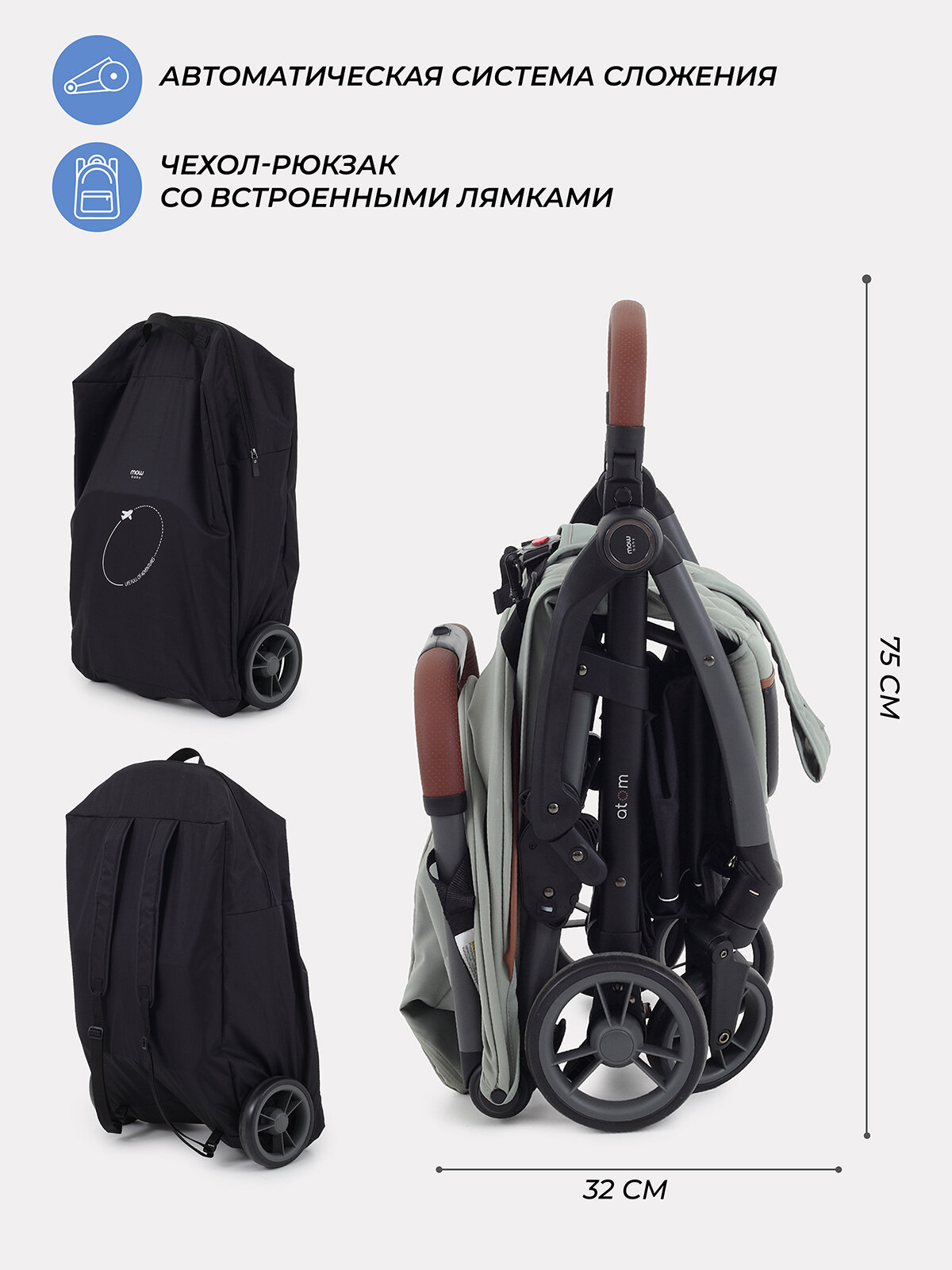 Коляска прогулочная детская с автосложением для путешествий MOWBaby "ATOM" MB200 Green интересное: