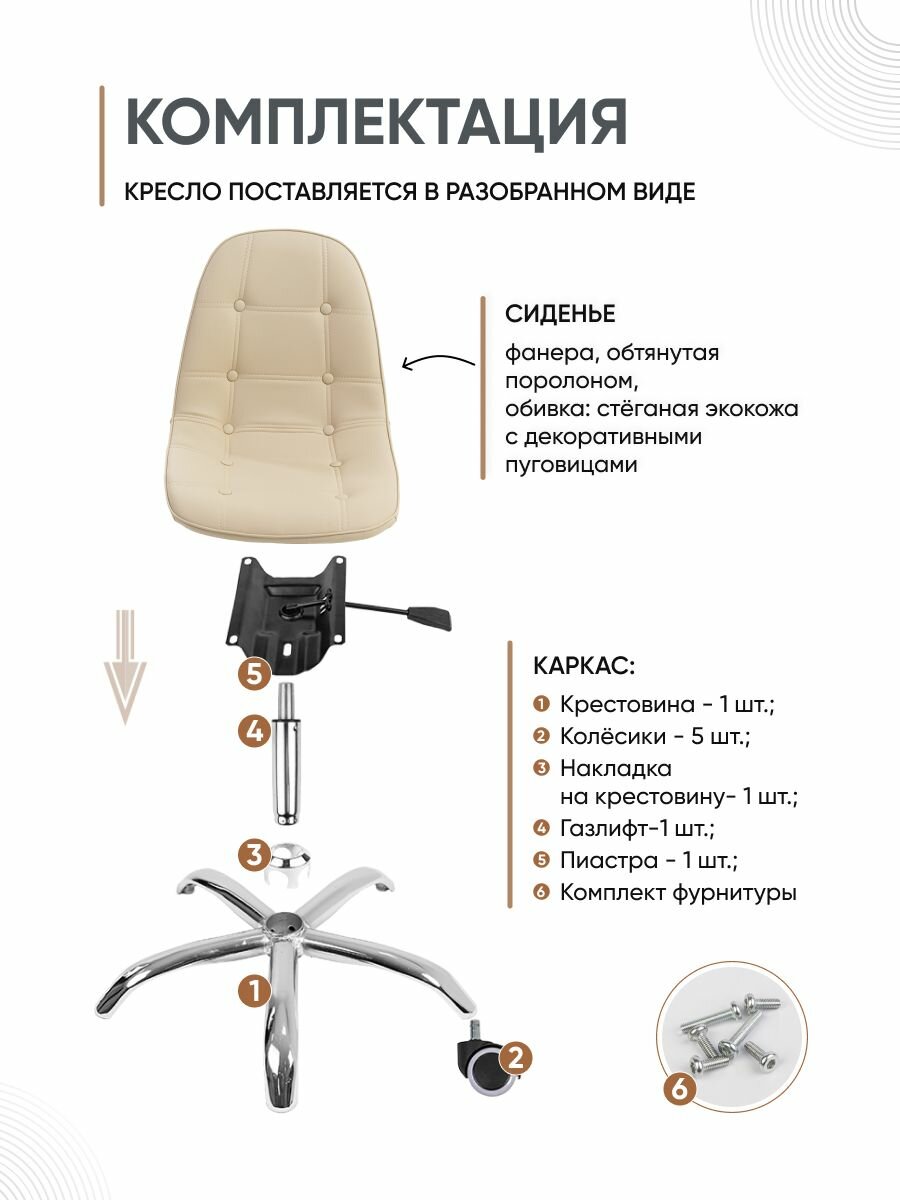 | Комплектация | Сиденье, колёсики, накладка на крестовину, газлифт, пиастра, комплект фурнитуры, инструкция |