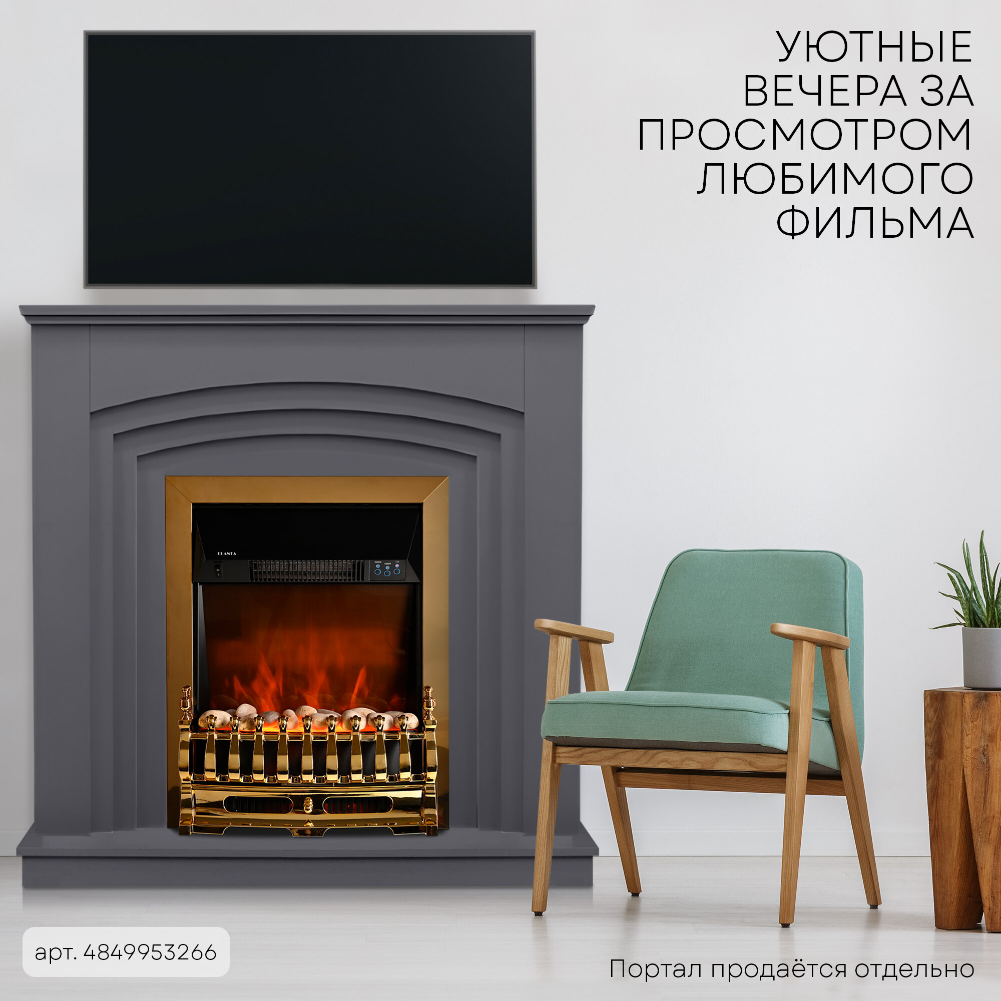 PLANTA Электрокамин PFP-FS400, отдельностоящий / встраиваемый камин электрический, пять уровней яркости пламени Real Life, цвет-золото