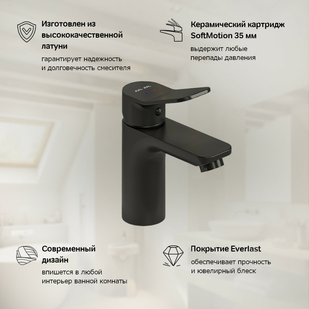 Cмеситель для раковины в ванную AM.PM Brava F88VA02122 излив 100 мм, черный, керамический стабилизирующий картридж Soft Motion, латунь