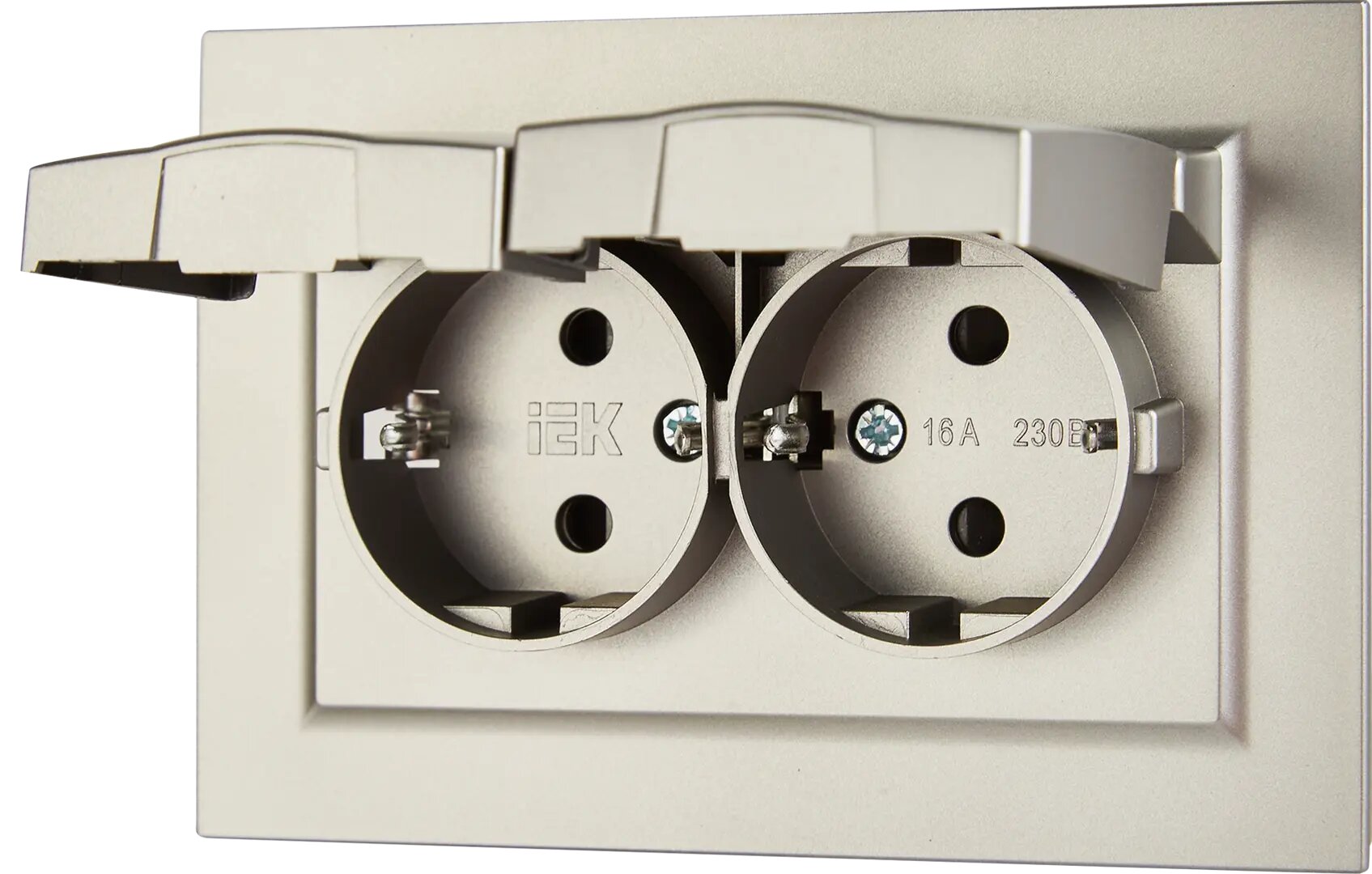 Розетка двойная с заземлением с защитными шторками и крышкой 16А в сборе IP44 шампань BRITE, IEK BR-R26-16-44-K37-F (1 шт.)