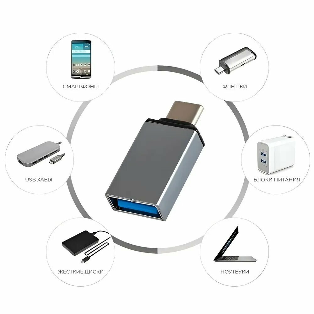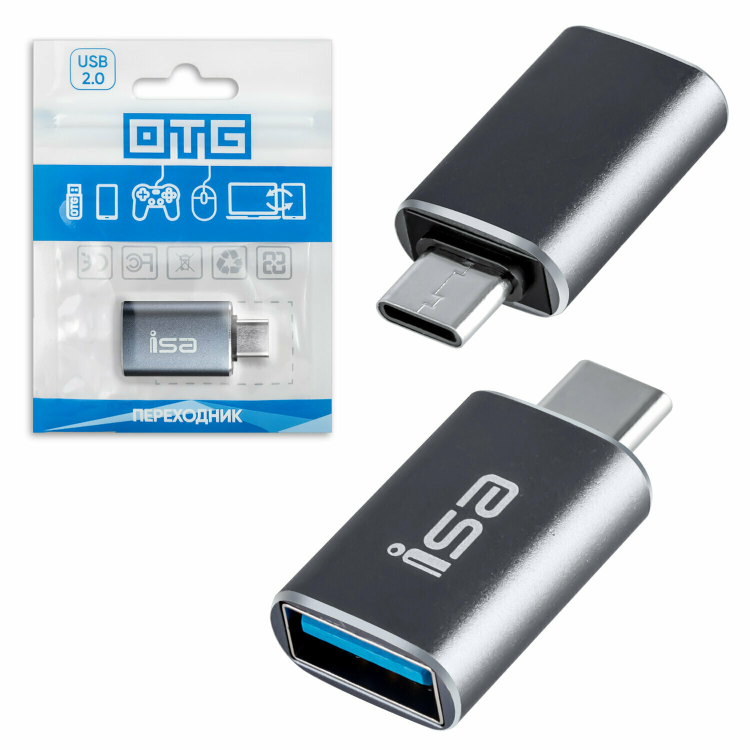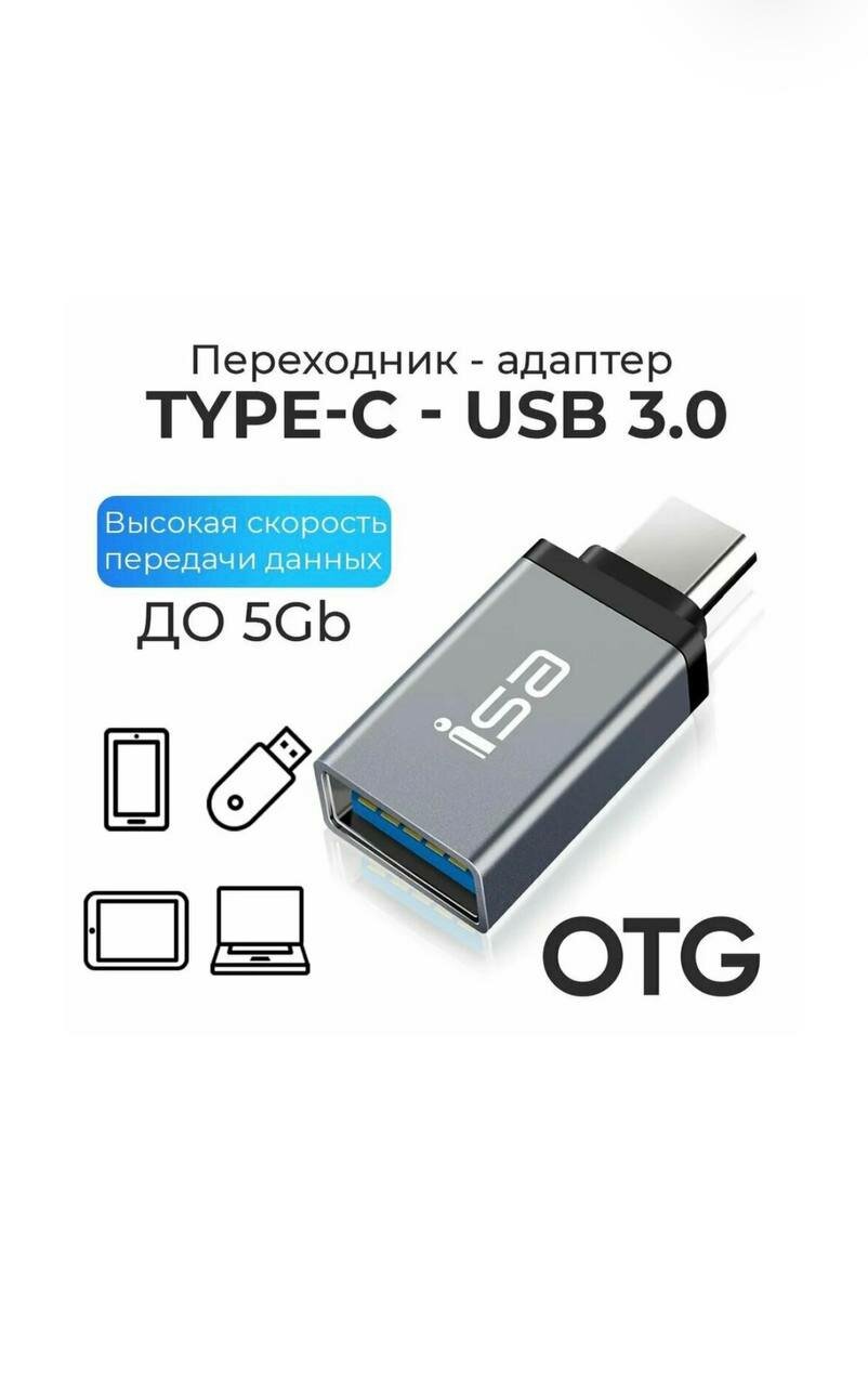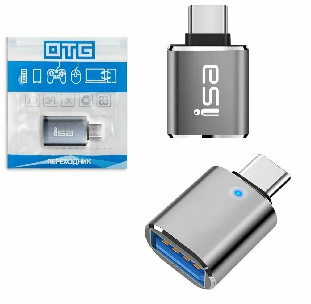 Переходник USB 3.0 на Type-C, Адаптер OTG USB-A 3.0 гнездо на Type-C штекер , ISA P-34 светло серый