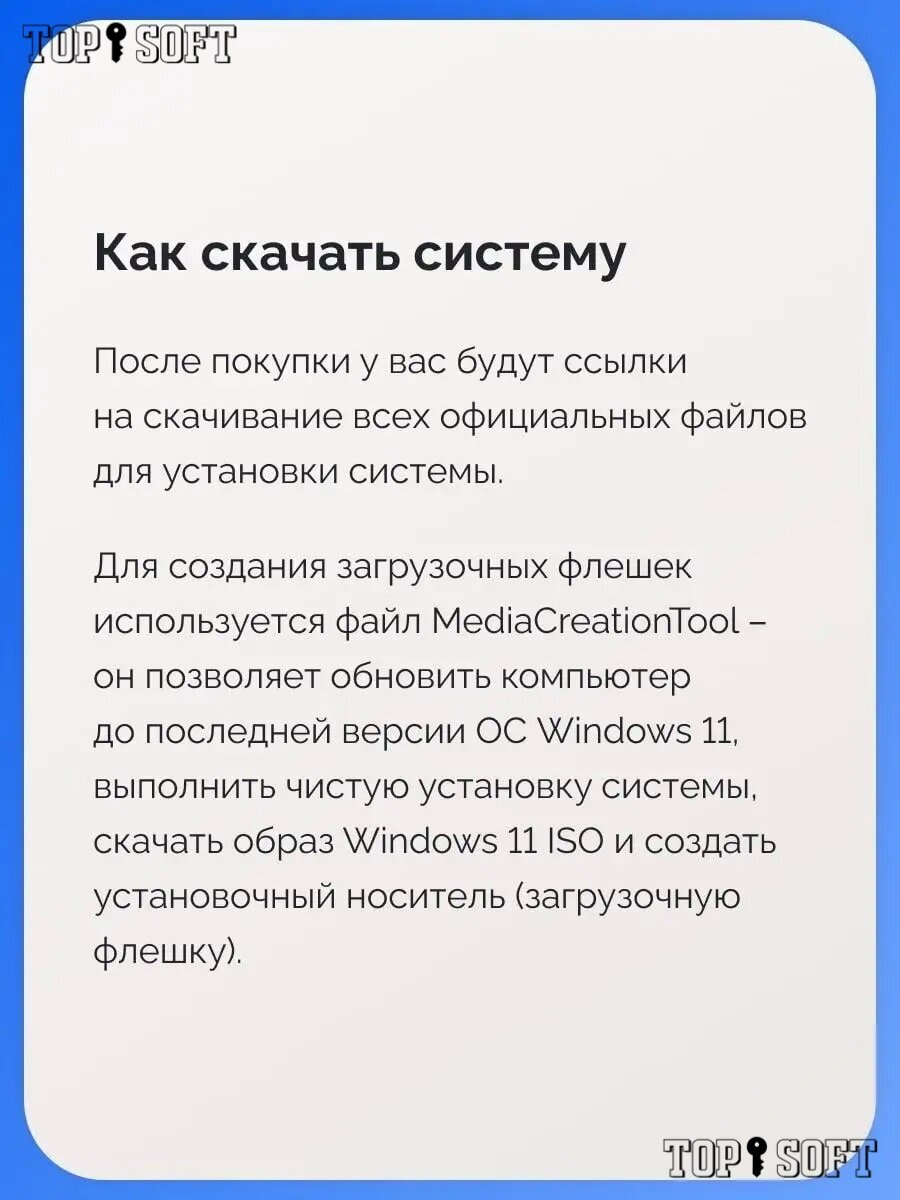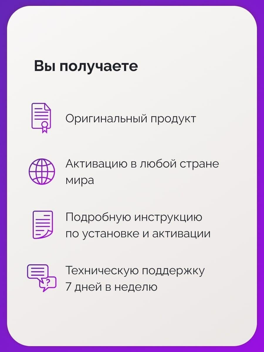 | Дополнительная информация | Ключ активации онлайн, привязка к Вашей учетной записи Microsoft - Привязка позволяет переносить лицензию на новое устройство при его смене на новое. Так же Вы без проблем восстановите лицензию при переустановки системы, Вам достаточно только войти в свою учетную запись Microsoft на ПК |
