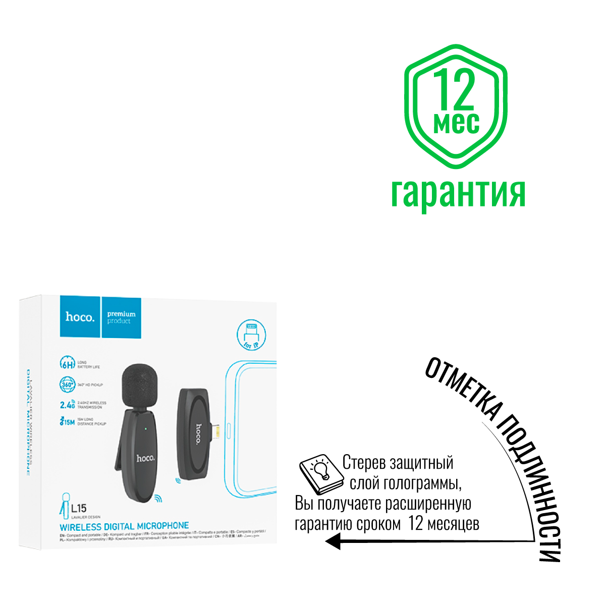 | Подробная комплектация | Беспроводной петличный микрофон HOCO L15 - 1шт. |