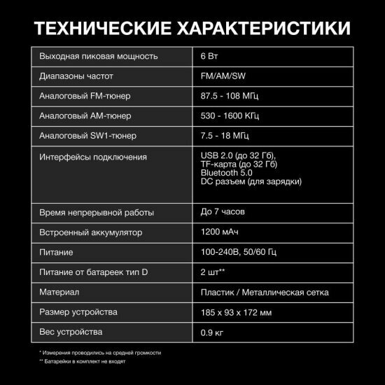 | Особенности | интерфейс USB (для флэш-накопителей), поддержка MP3, поддержка карт памяти, работа от сети, разъем для наушников |