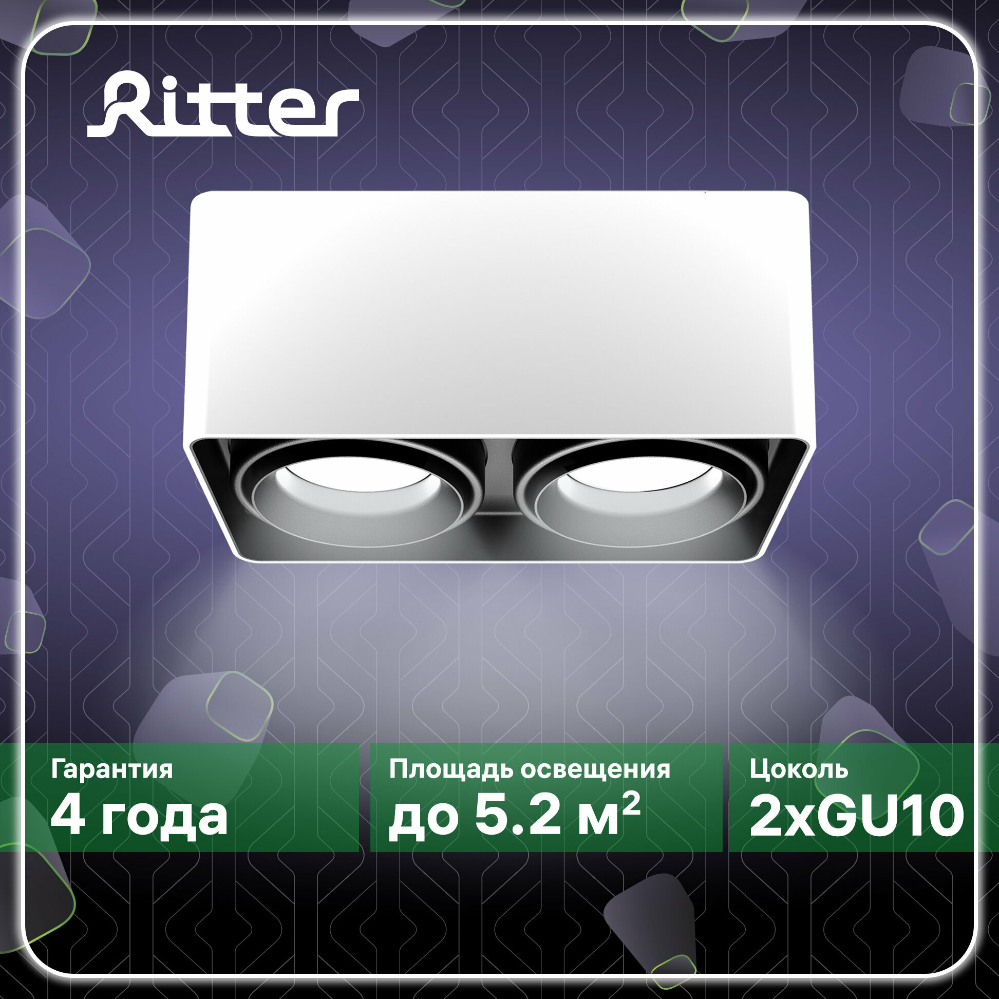 Светильник накладной Arton прямоугольник 200х105х100мм 2хGU10 алюминий белый/черный 51407 7 Ritter интересное: