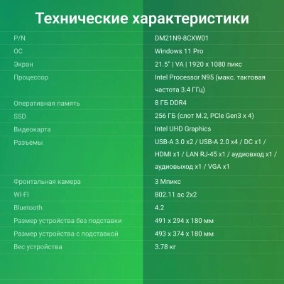 Моноблок Digma Action, 21.5", VA, Intel N-series N95, DDR4 8ГБ, SSD 256, Intel UHD Graphics 600, Windows 11 Professional, черный (dm21n9-8cxw01)