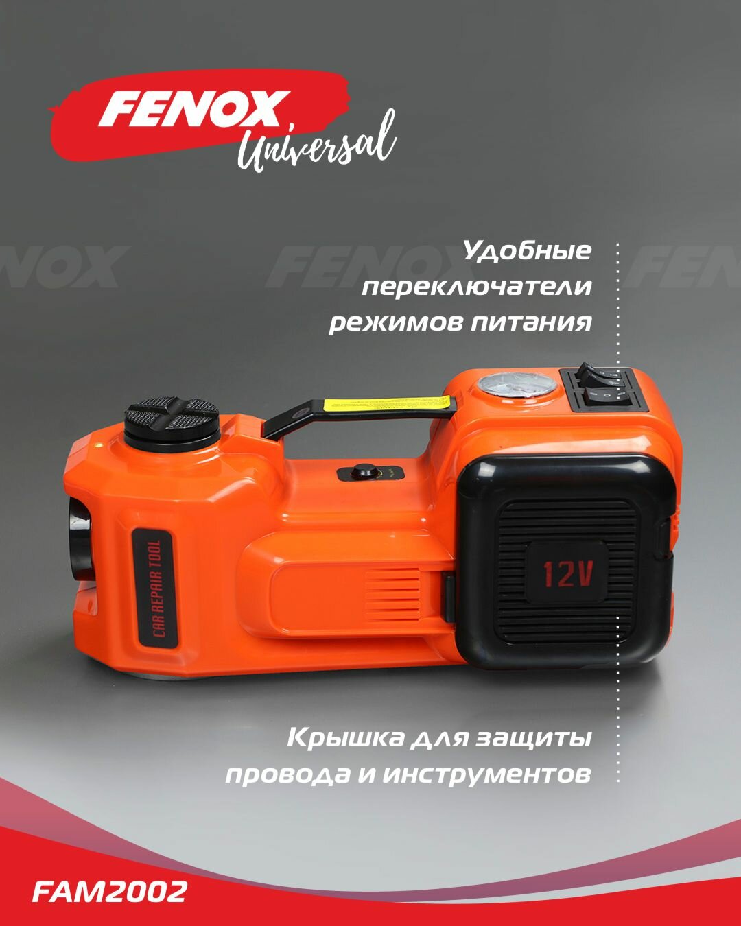 FENOX FAM2002 домкрат электрогидравлический с функцией компрессора и фонарем, в кейсе ,