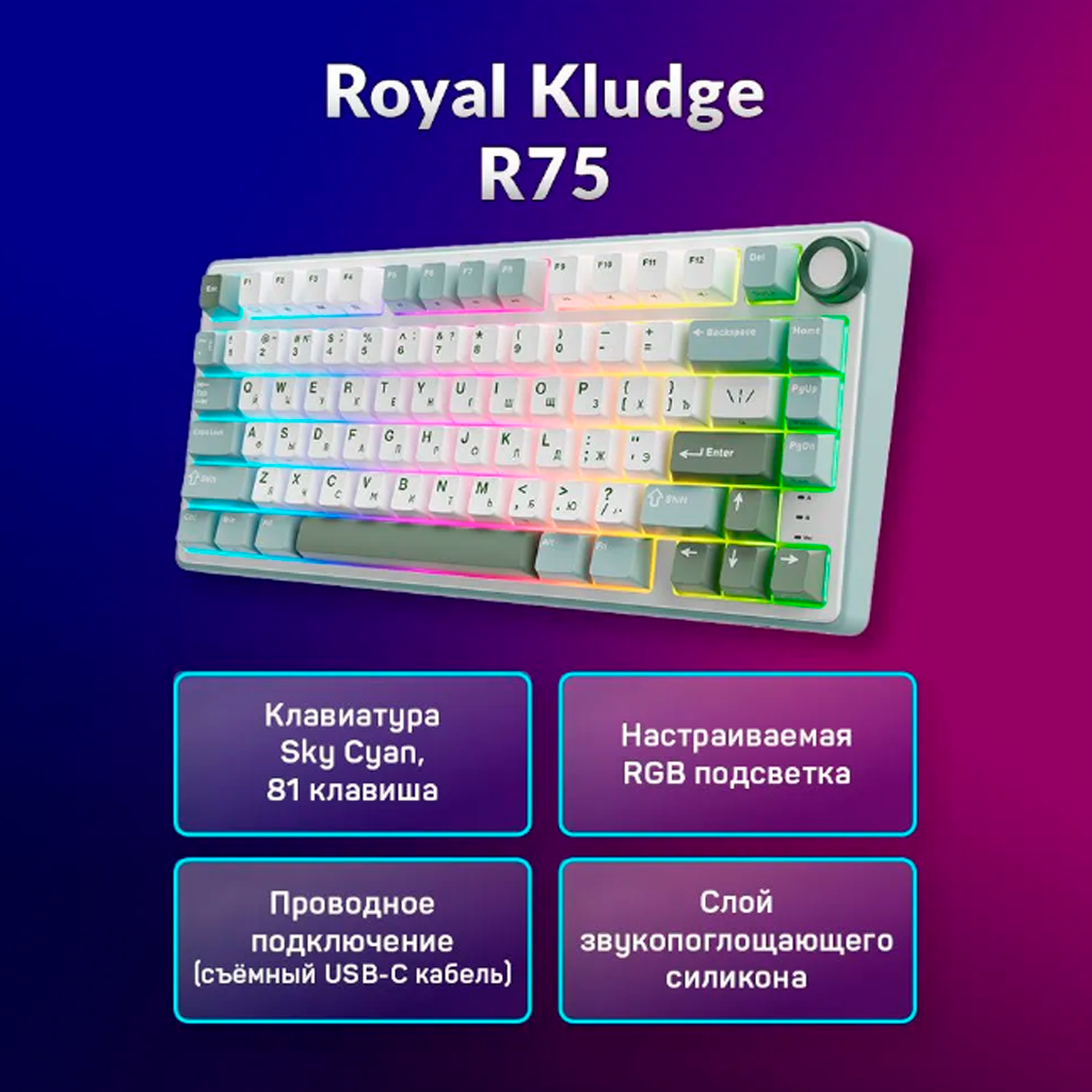 Клавиатура ROYAL KLUDGE R75 механическая компактная (75%) 81 клавиша, проводная, Gasket Mount, цвет Sky Cyan (switch RK Silver)