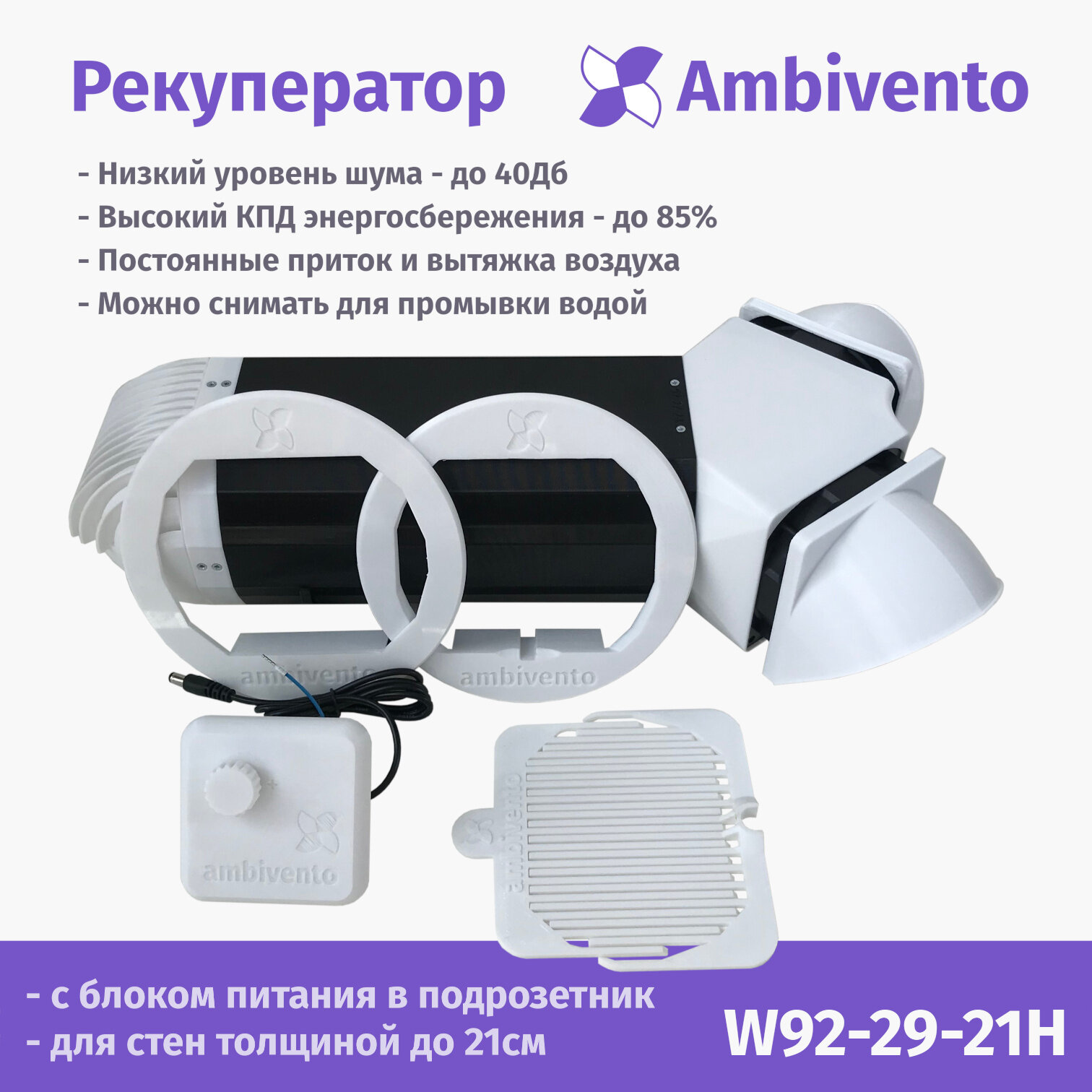 Купить Съемный рекуператор воздуха Ambivento для стен толщиной до 21см с блоком питания для монтажа в подрозетник