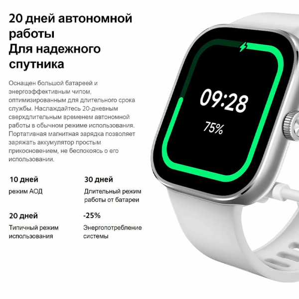 | Дополнительная информация | Длительное время работы, Увеличенный AMOLED дисплей 1.97″, Улучшенный мониторинг здоровья Тип аккумулятора встроенный, Работа от аккумулятора до 20 дней, Зарядка от USB порта, Водоустойчивый корпус, Голосовые вызовы по Bluetooth, Встроенный микрофон, Бег, Фитнес, Измерение пульса, Шагомер, Уровень кислорода в крови, Отслеживание сна, 1 в комплекте |