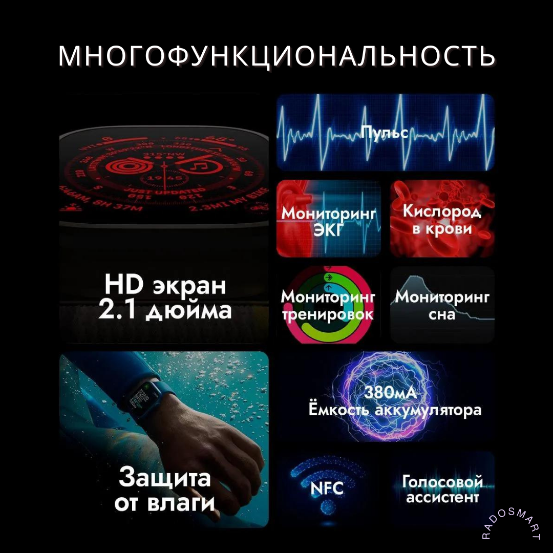 | Мониторинг | водный баланс, калорий, пульса, сна, температуры тела, термометр, тонометр, уровня кислорода в крови, уровня сахара в крови, физической активности |