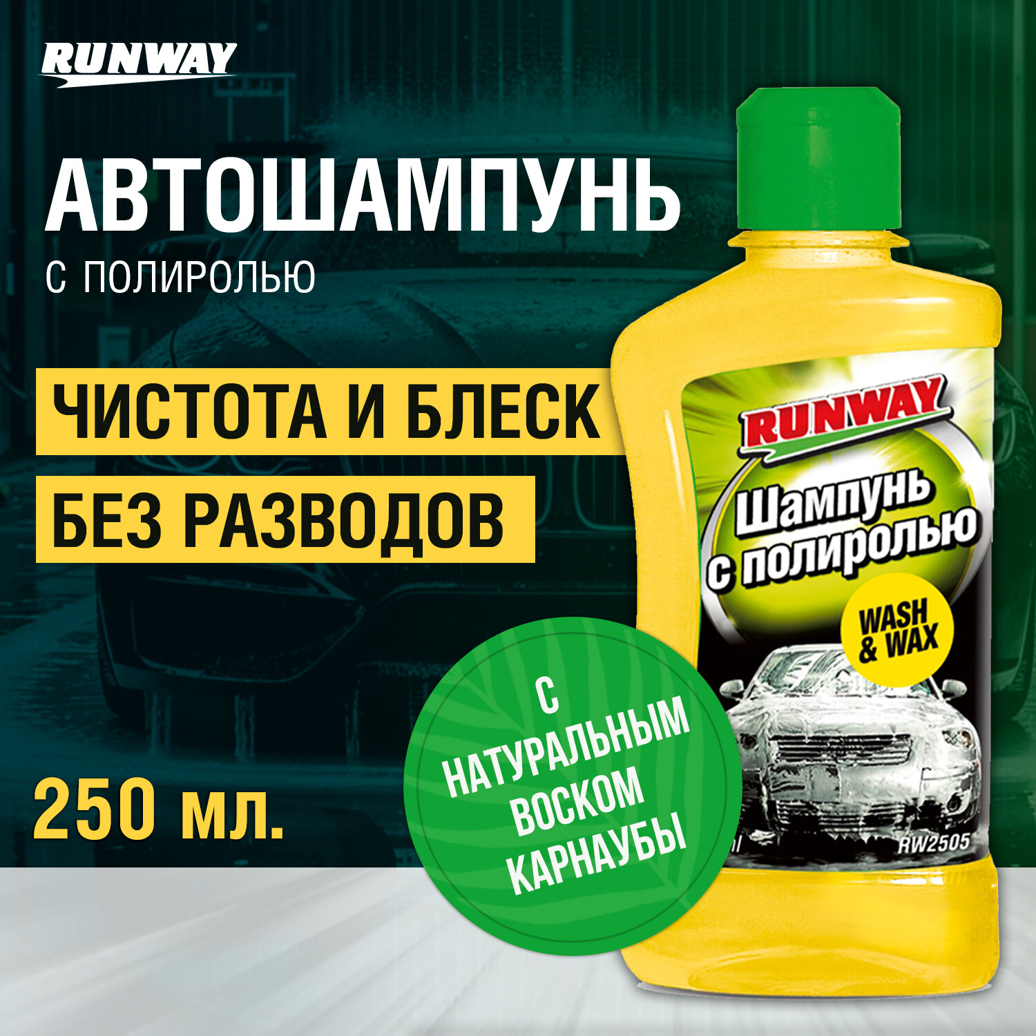 Автошампунь-полироль Runway с воском карнаубы, 250 мл, для ручной мойки автомобиля RW2505