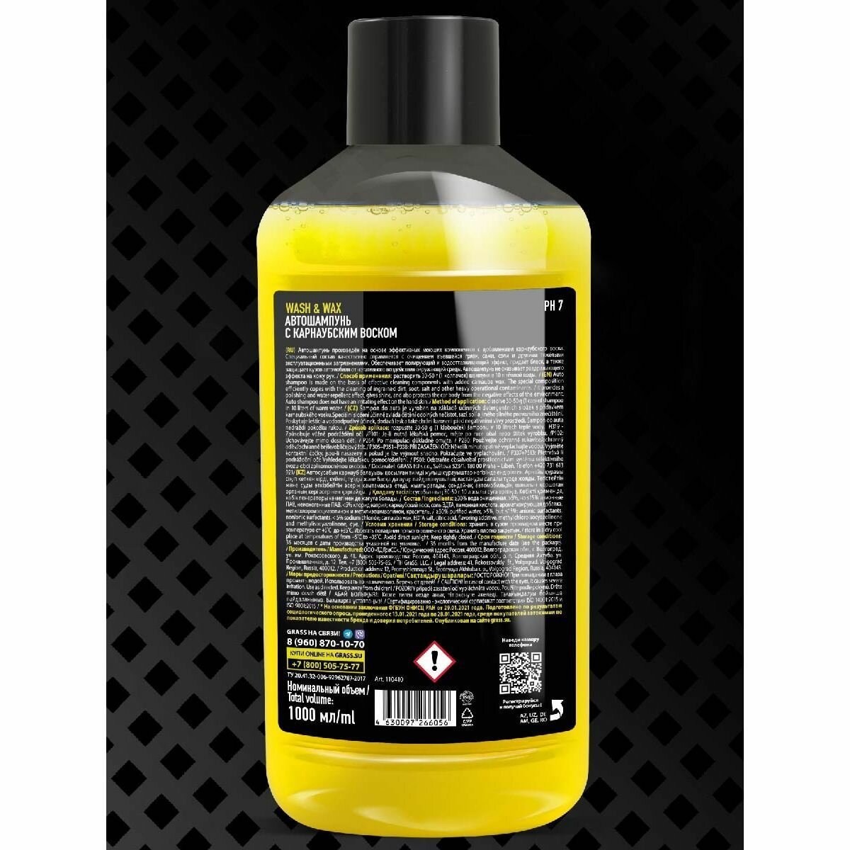 | Дополнительная информация | АВТОШАМПУНЬ (1 л) c карнаубским воском Автошампунь произведён на основе эффективных моющих компонентов с добавлением карнаубского воска. Специальный состав качественно справляется с очищением въевшейся грязи, сажи, соли и другими тяжёлыми эксплуатационными загрязнениями. Обеспечивает полирующий и водоотталкивающий эффект, придаёт блеск, а также защищает кузов автомобиля от негативного воздействия окружающей среды. Автошампунь не оказывает раздражающего эффекта на кожу рук. |