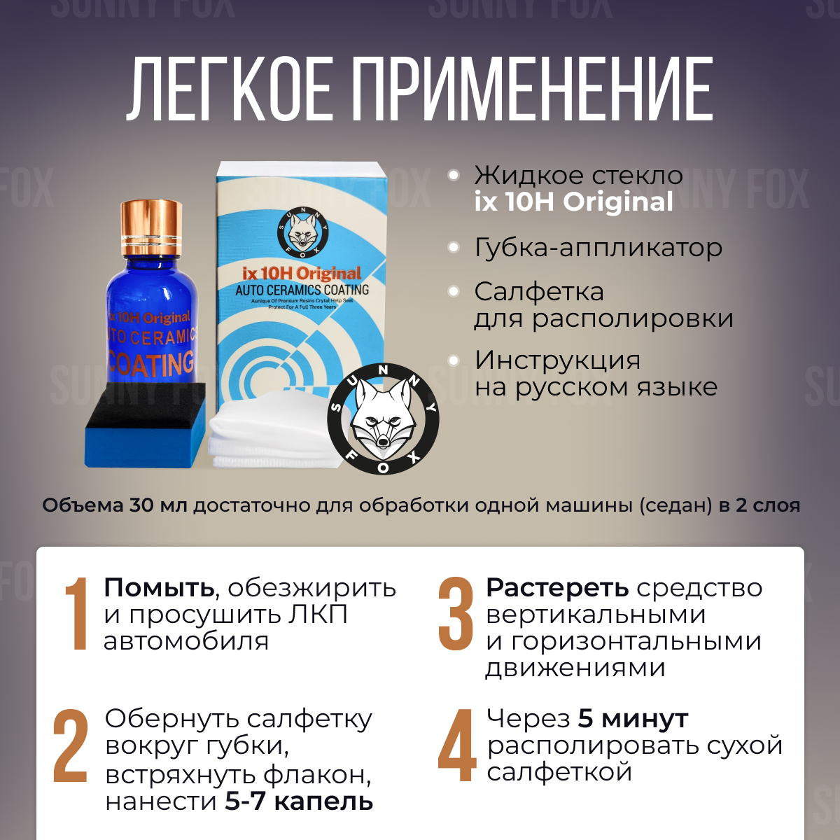 | Подробная комплектация | 1. Жидкое стекло ix 10H 30 мл. 2. Губка-аппликатор для нанесения покрытия на кузов автомобиля. 3. Салфетка для располировки. |