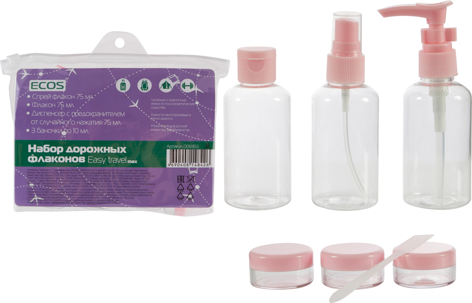 Дорожный набор ECOS, 6 предметов, бесцветный, розовый