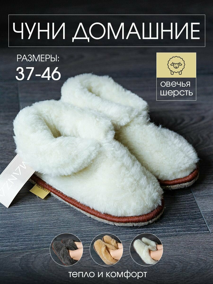 Чуни домашние женские, размер 43-44, бабуши меховые из овечьей шерсти, тапочки закрытые на войлочной подошве, белые