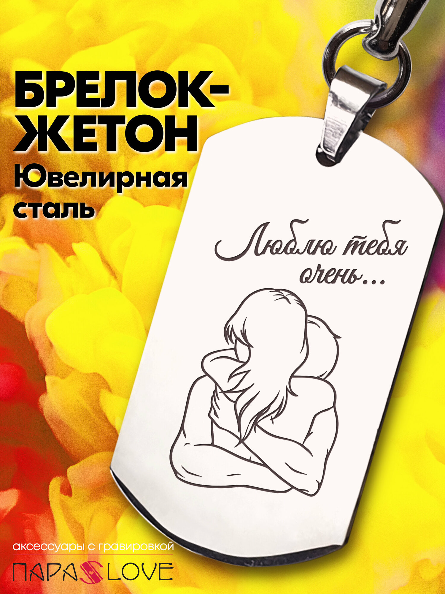 Купить Брелок для ключей мужской с надписью "Люблю тебя очень..." в упаковке с лазерной гравировкой. Жетон на сумку, рюкзак, на ключи от авто и дома.