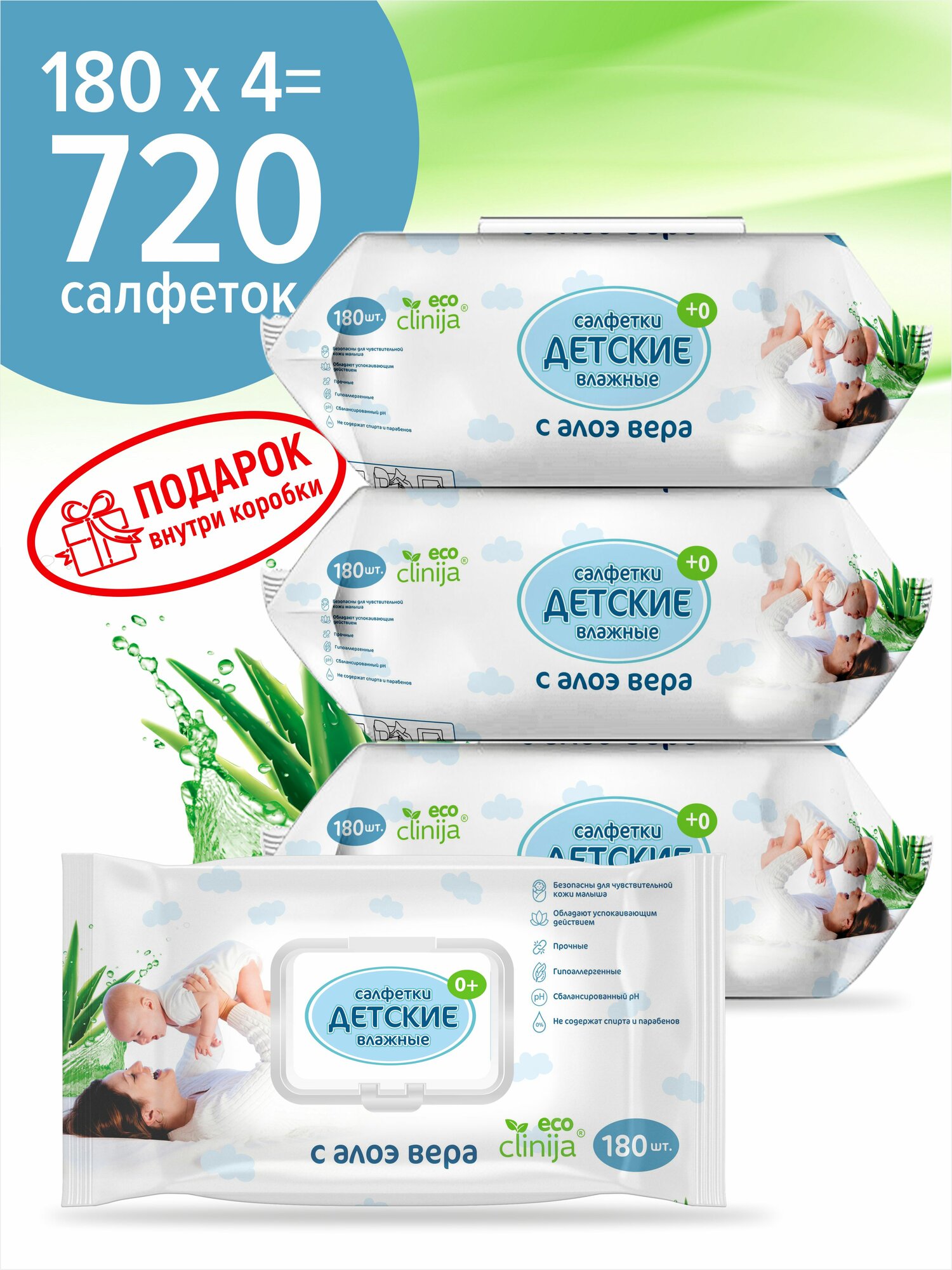 Детские влажные салфетки ECO с Алоэ вера 130*150мм, 6 упаковок по 120 шт.+подарок, без спирта, гипоаллергенные, для новорожденных 0+
