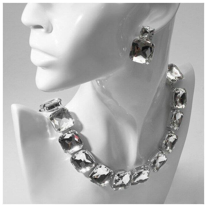Queen fair Набор 2 предмета: серьги, колье «Драгоценность» квадраты, цвет белый в серебре, 32 см
