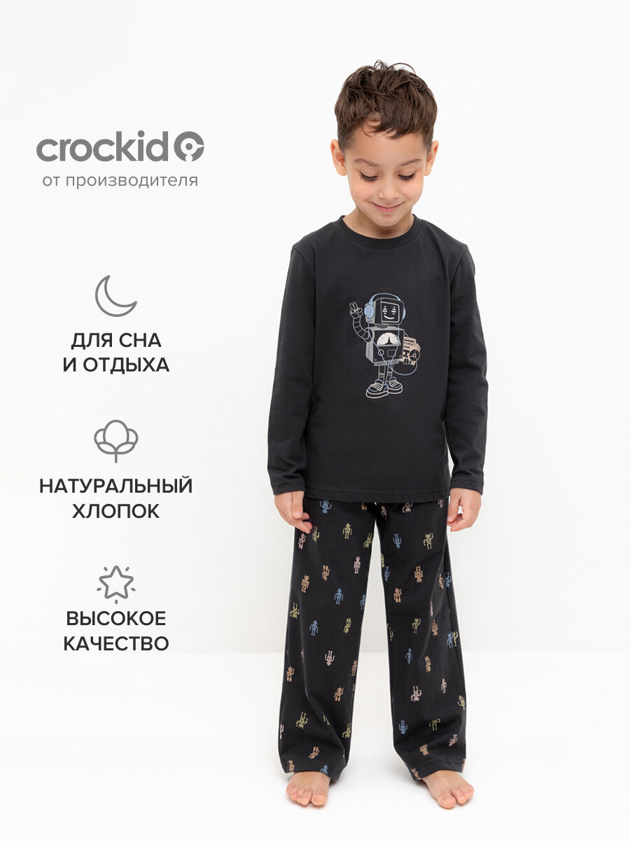 Пижама Crockid К 1600/угольный серый,цветные роботы р 76/146 для мальчика из натруального хлопка