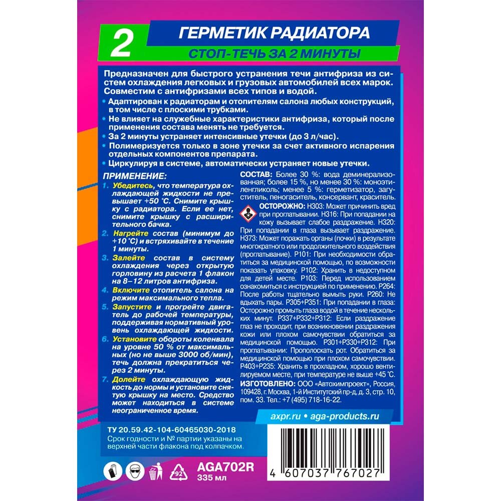 | Подробная комплектация | Герметик Радиатора AGA702R/335 мл |