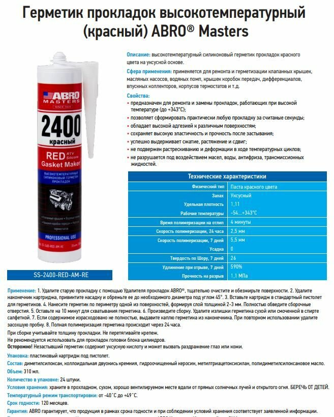 Герметик прокладок высокотемпературный (красный) 310 мл ABRO MASTERS SS2400REDAMRE