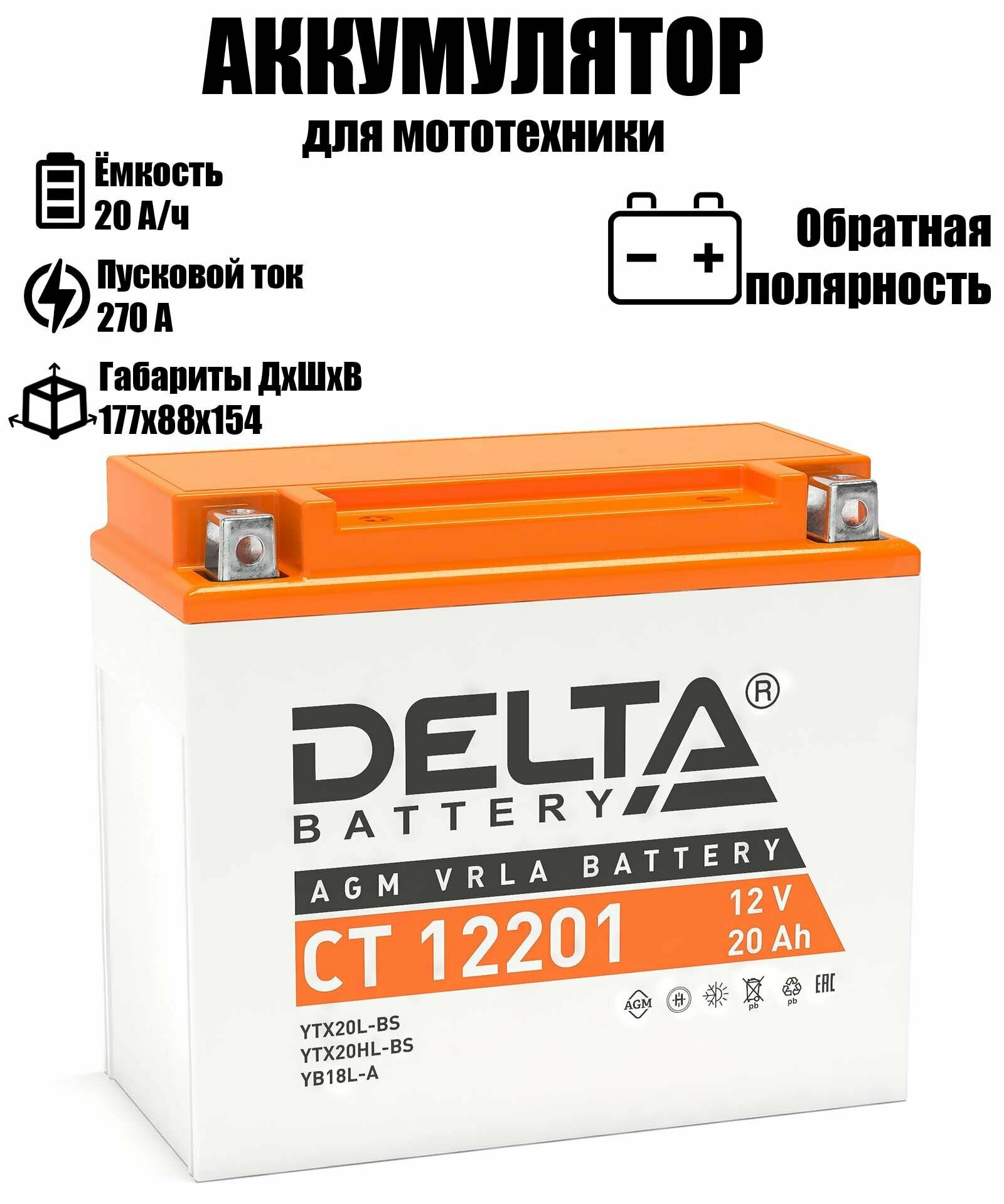 Мото аккумулятор стартерный Delta CT 1220 12В 20Ач обратная полярность 250А (12V 20Ah) (Y50-N18L-A3; YTX24HL-BS; YTX24HL) AGM, аккумулятор для мотоцикла, квадроцикла, снегохода, дизельных генераторов