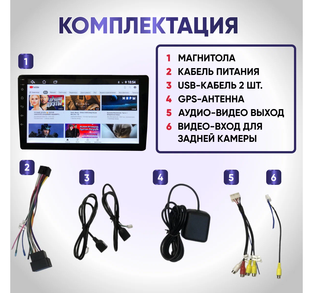 | Подробная комплектация | Магнитола 2din 9 дюймов Провод на камеру заднего вида Фишка с RCA Фишка питания универсальная 16 pin - Evro 2 USB GPS модуль |