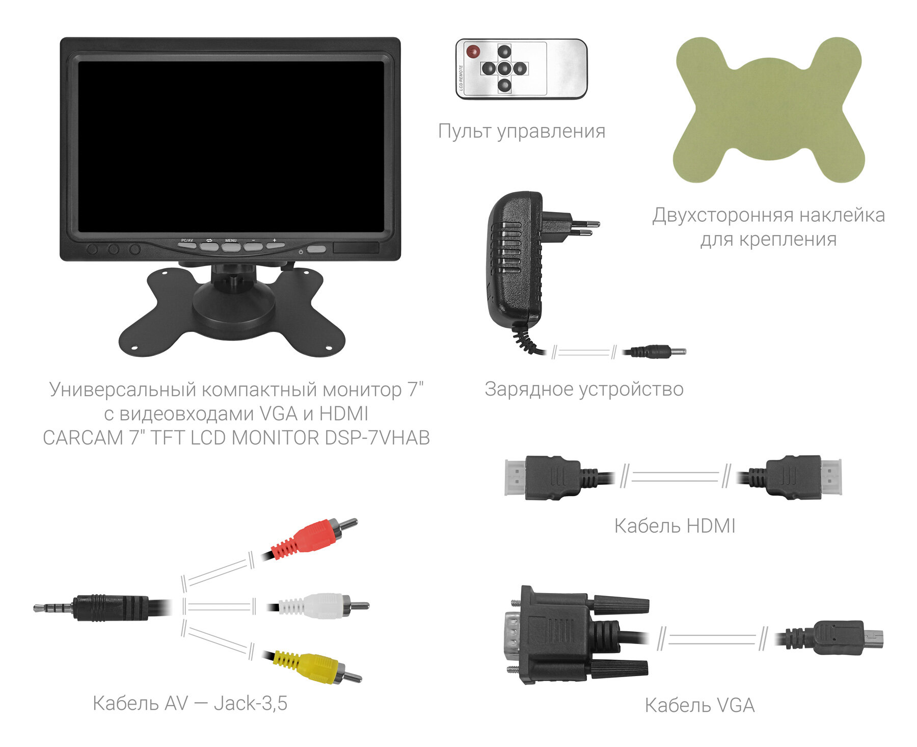 Универсальный компактный монитор 7’’ с видеовходами VGA и HDMI CARCAM 7'' TFT LCD MONITOR DSP-7VHAB